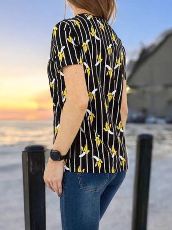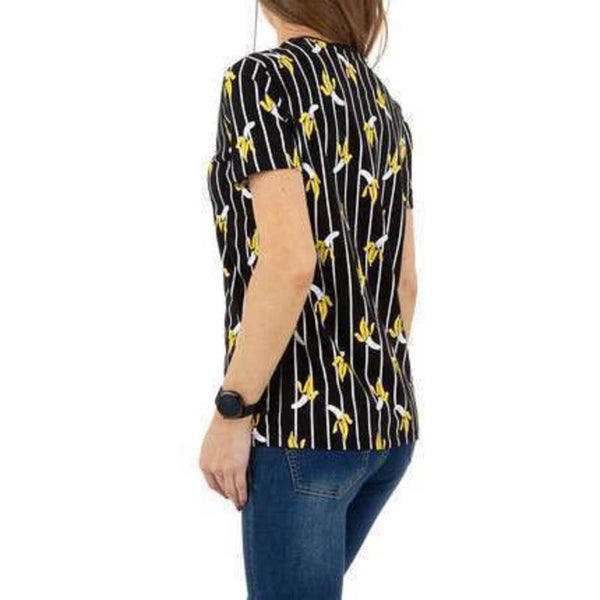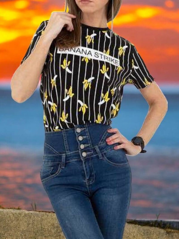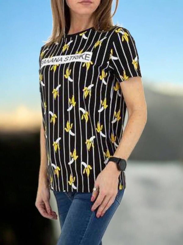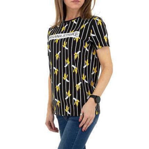 T-shirt élégant, rayures verticales, banane jaune, texte « Banana Strike », col rond, manches courtes, couleurs : noir, jaune, blanc, 100 % coton, taille : S, mesuré à plat : épaules : 39 cm, longueur : 64,5 cm, aisselles, 49 cm Marque : Glo-story