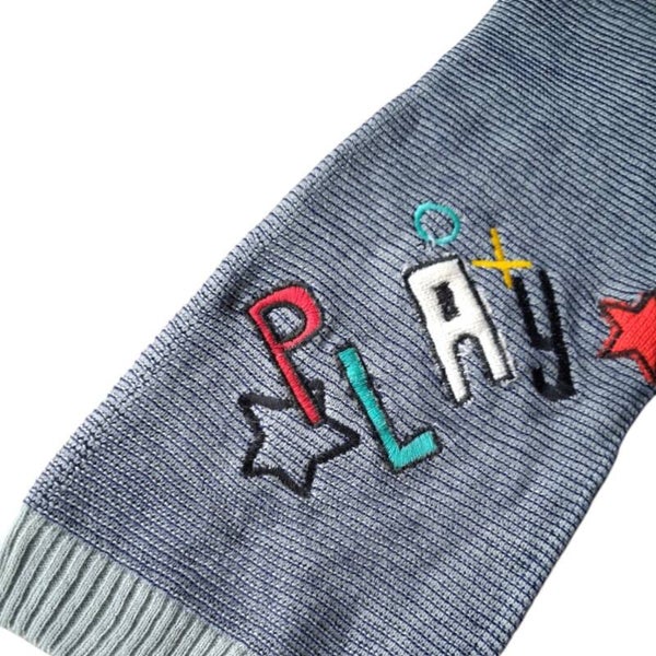 Cadeautip. Stoere en warme sjaal streepjes structuur Kleuren blauw grijs rood geel wit tekst "play" maat: one size.
