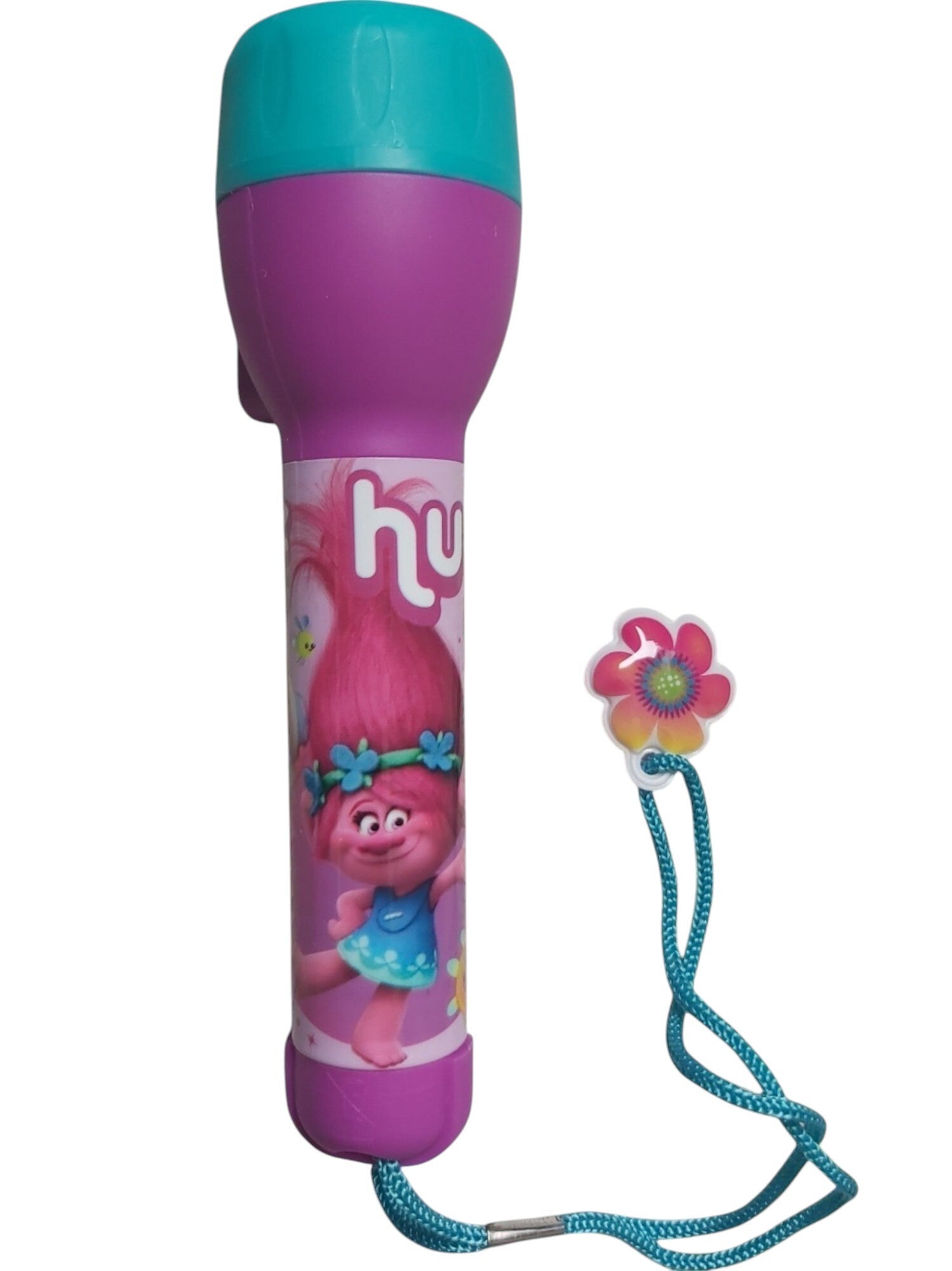 Neem de Trolls mee op een avontuur in het donker. Deze zaklamp is gemaakt van stevig kunststof en heeft een print van trolls rondom. Batterijen niet inbegrepen. (2xAA). merk: Global kids gewicht 76 gram