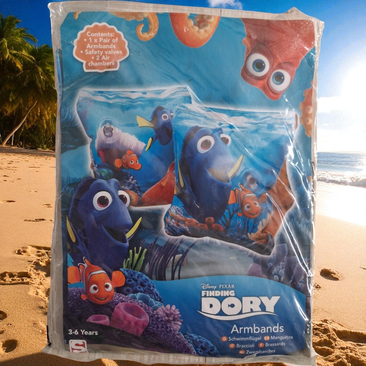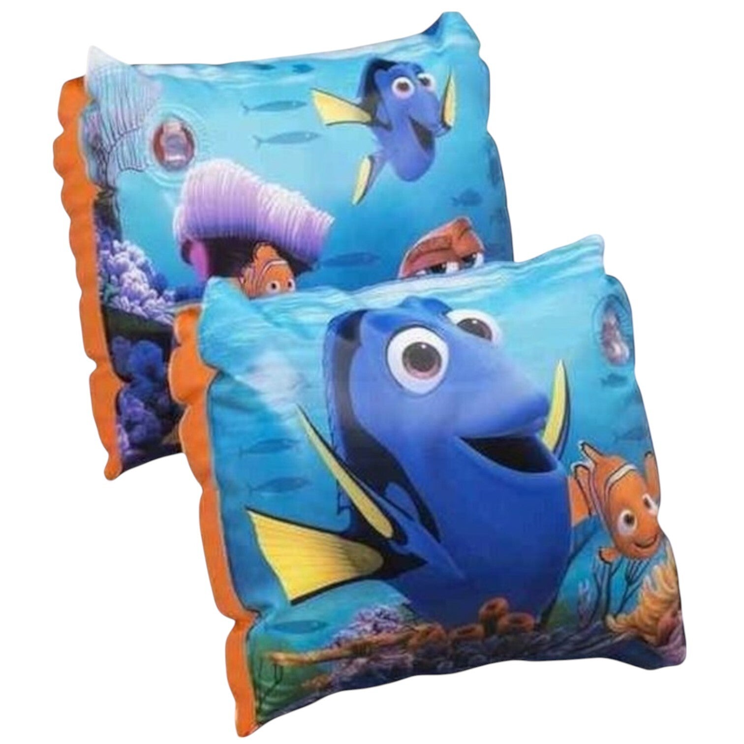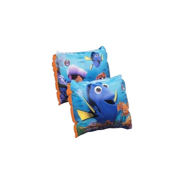 Finding Dory zwembandjes. Zwemmouwtjes met Finding Dory opdruk. De zwembandjes zijn geschikt voor kinderen vanaf 36 maanden. Met Nederlandse gebruiksaanwijzing. Voldoet aan de keurmerken/veiligheidsnormen, CE gekeurd en getest. Geschikt voor kinderen tussen de 18 en 30 kg.