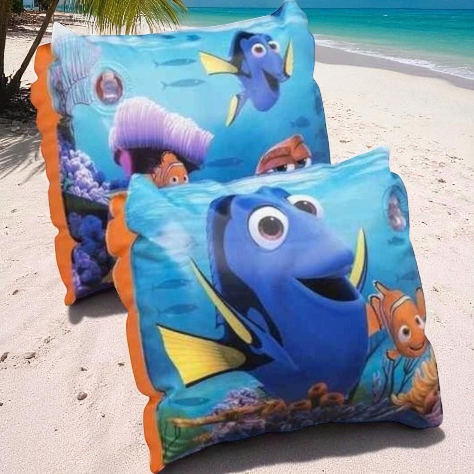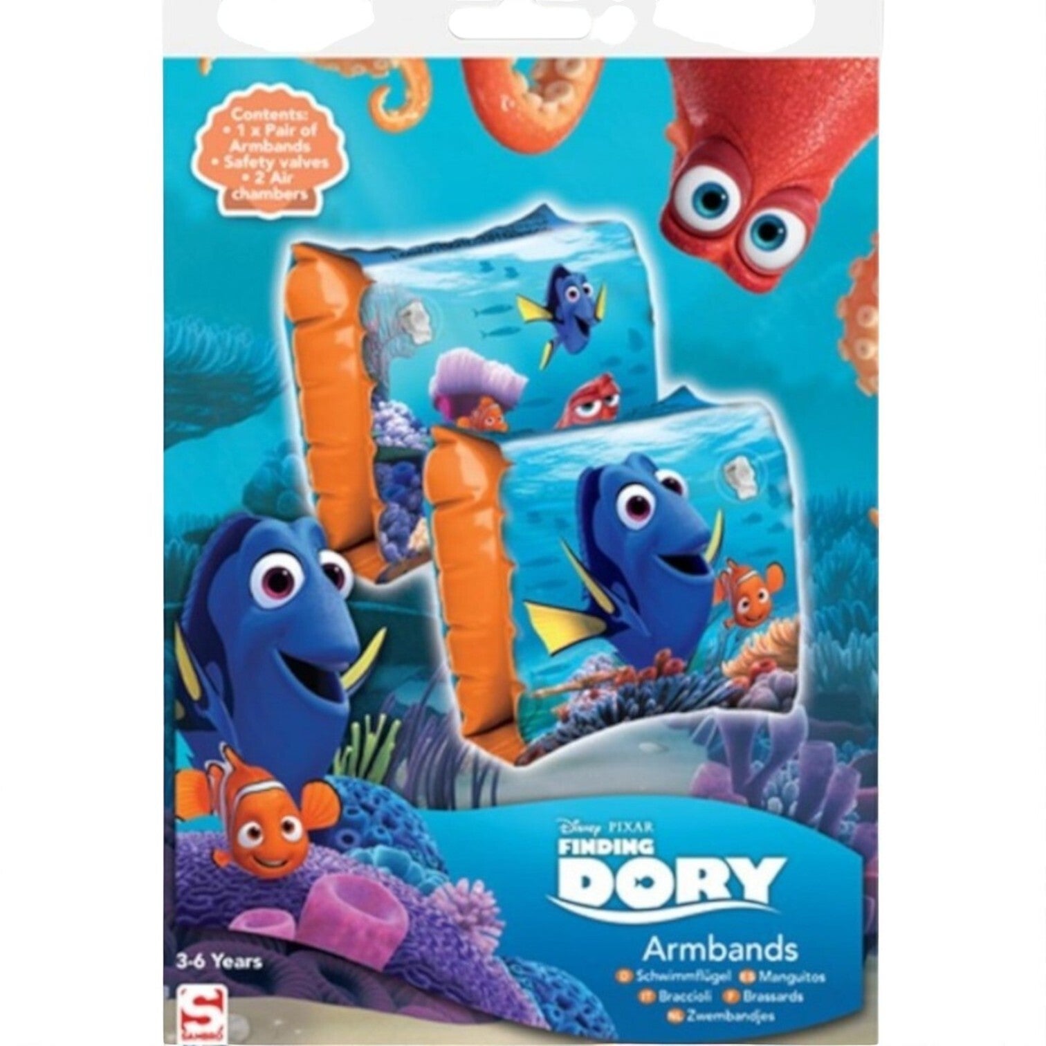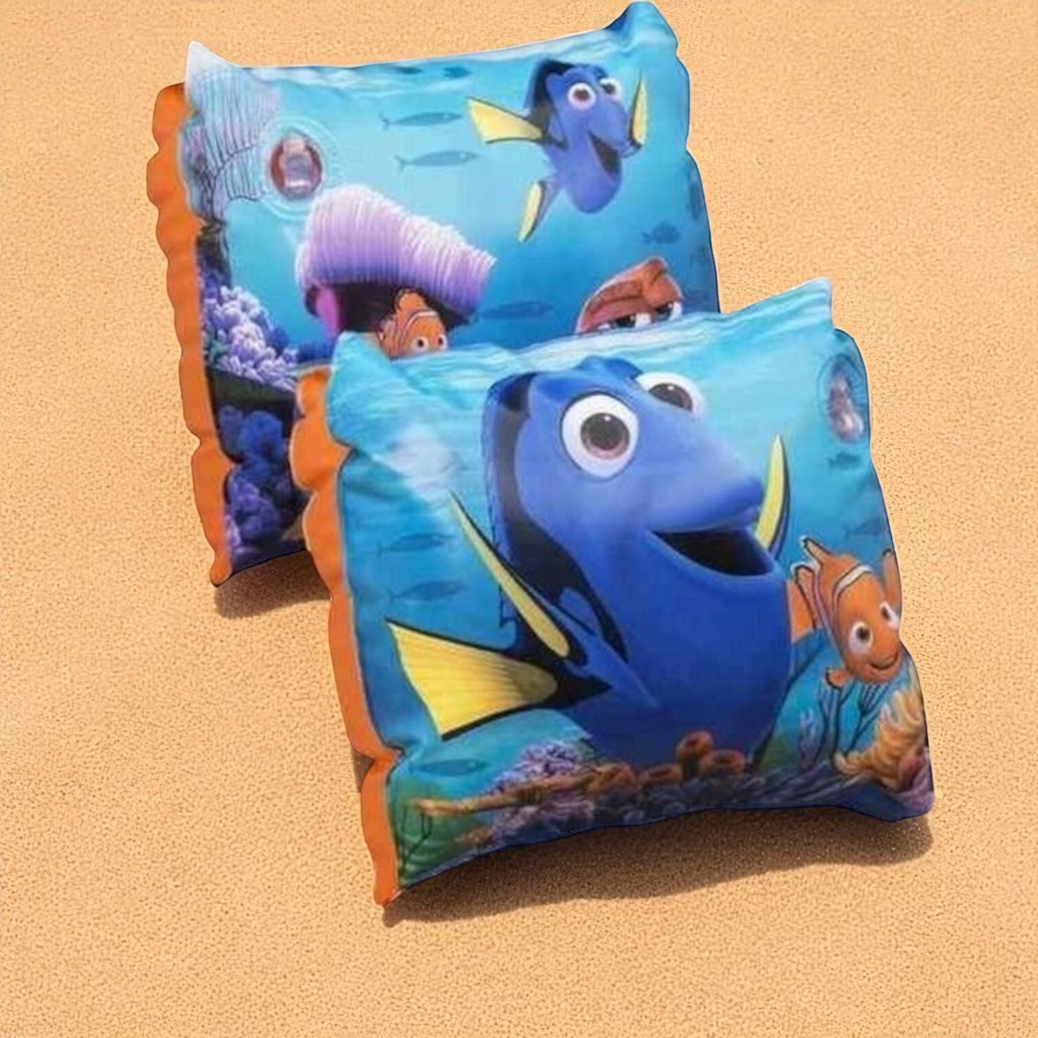 Finding Dory zwembandjes. Zwemmouwtjes met Finding Dory opdruk. De zwembandjes zijn geschikt voor kinderen vanaf 36 maanden. Met Nederlandse gebruiksaanwijzing. Voldoet aan de keurmerken/veiligheidsnormen, CE gekeurd en getest. Geschikt voor kinderen tussen de 18 en 30 kg.