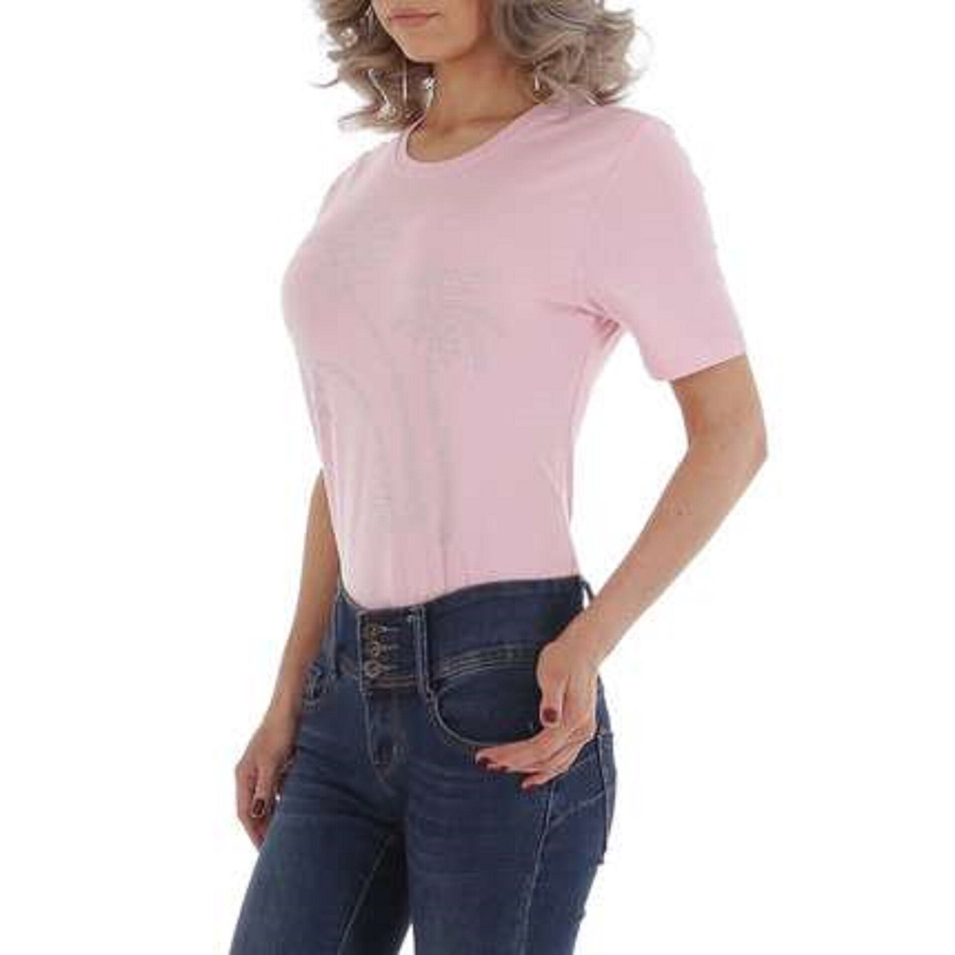 t-shirt strak getailleerd kleur lichtroze met glitter palmbomen ronde hals korte mouwen 95% katoen en 5% elasthane met stretch Maat: 44 afmetingen plat gemeten oksel 51cm schouder 39cm lengte 66cm merk Glo-story