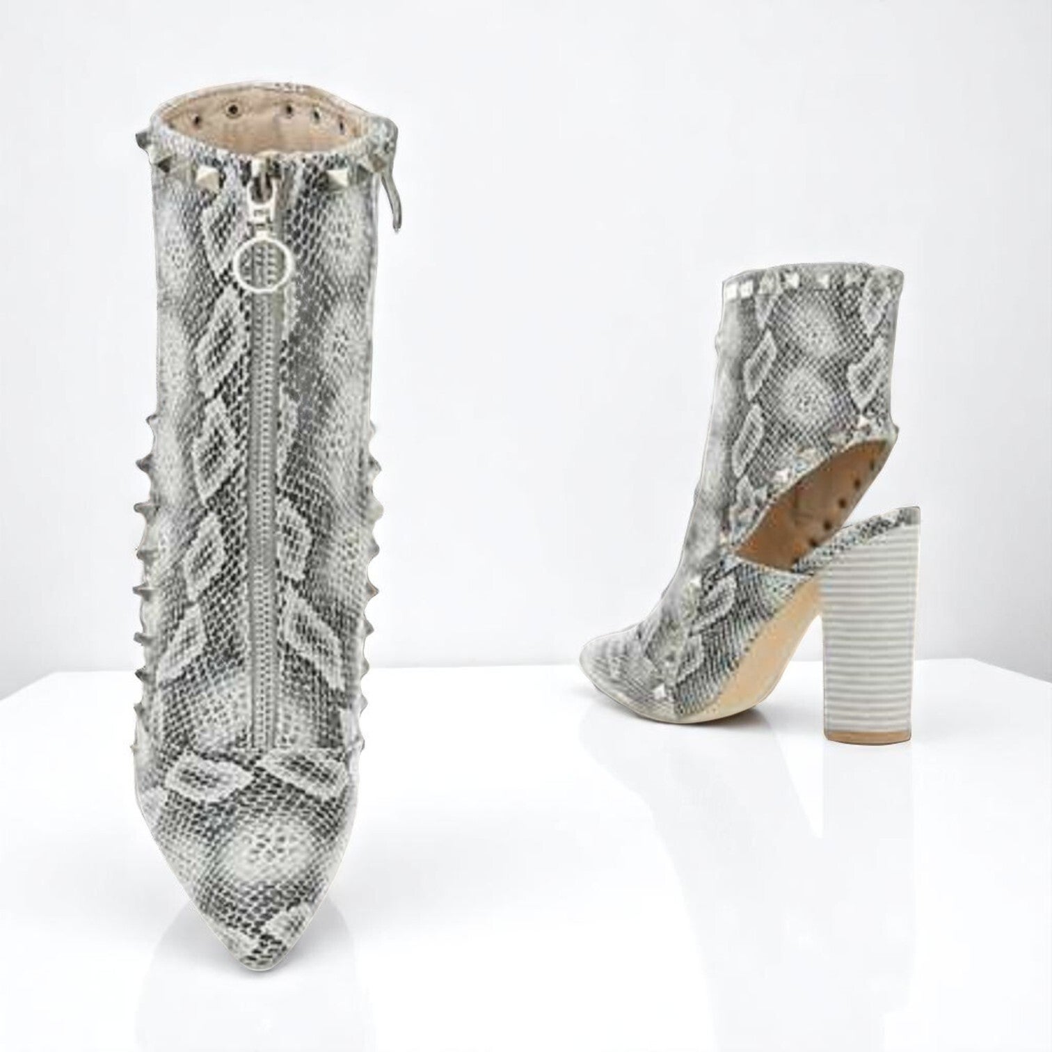 Sjieke enkellaarsjes grijs slangenprint met zilverkleurige studs en open hiel. Deze enkellaarsjes hebben een puntneus. Aan de binnenkant zit de ritssluiting. Maat 39. Hakhoogte 11cm. Totale hoogte 23cm. merk Sergio Todzi.