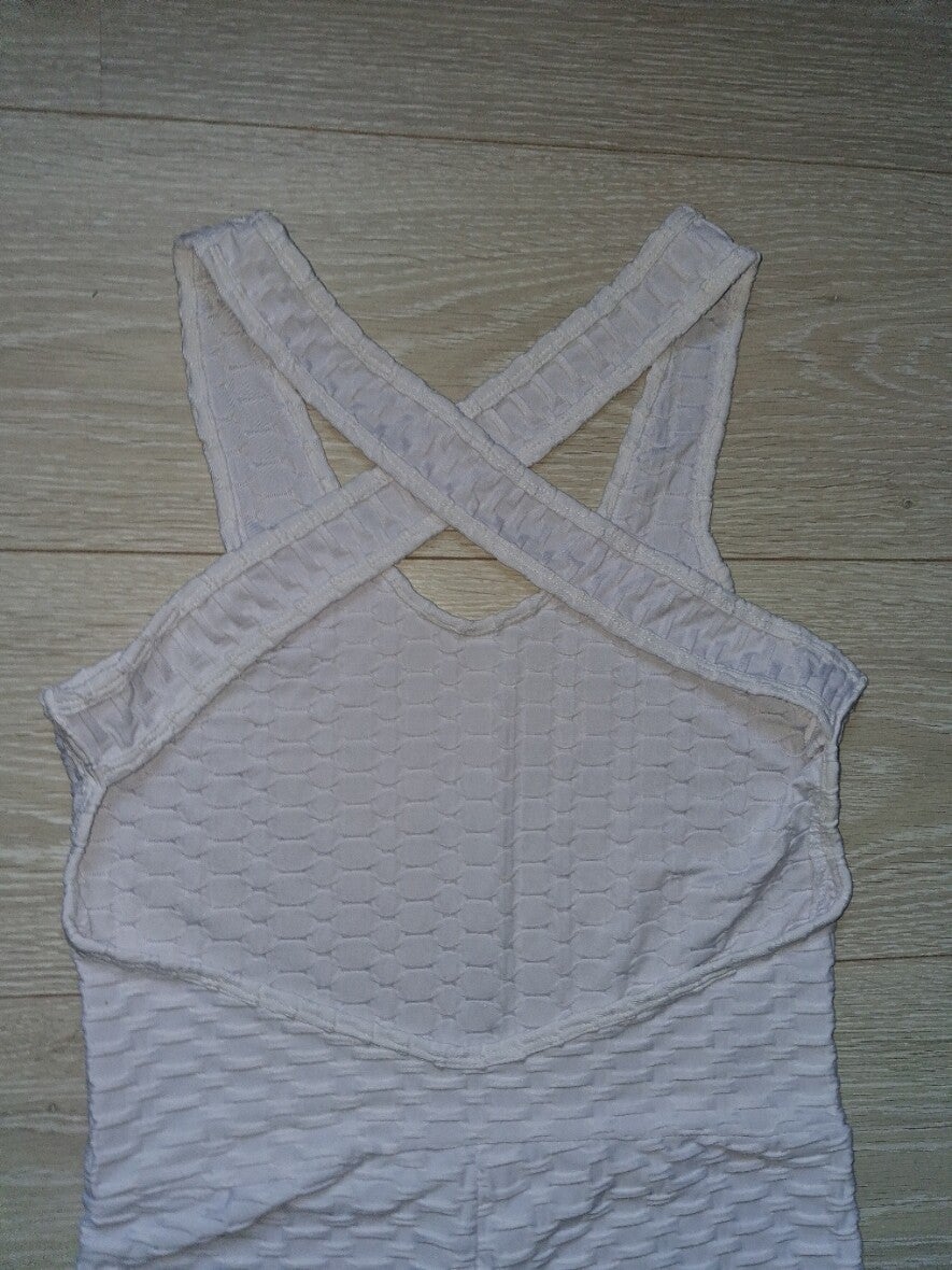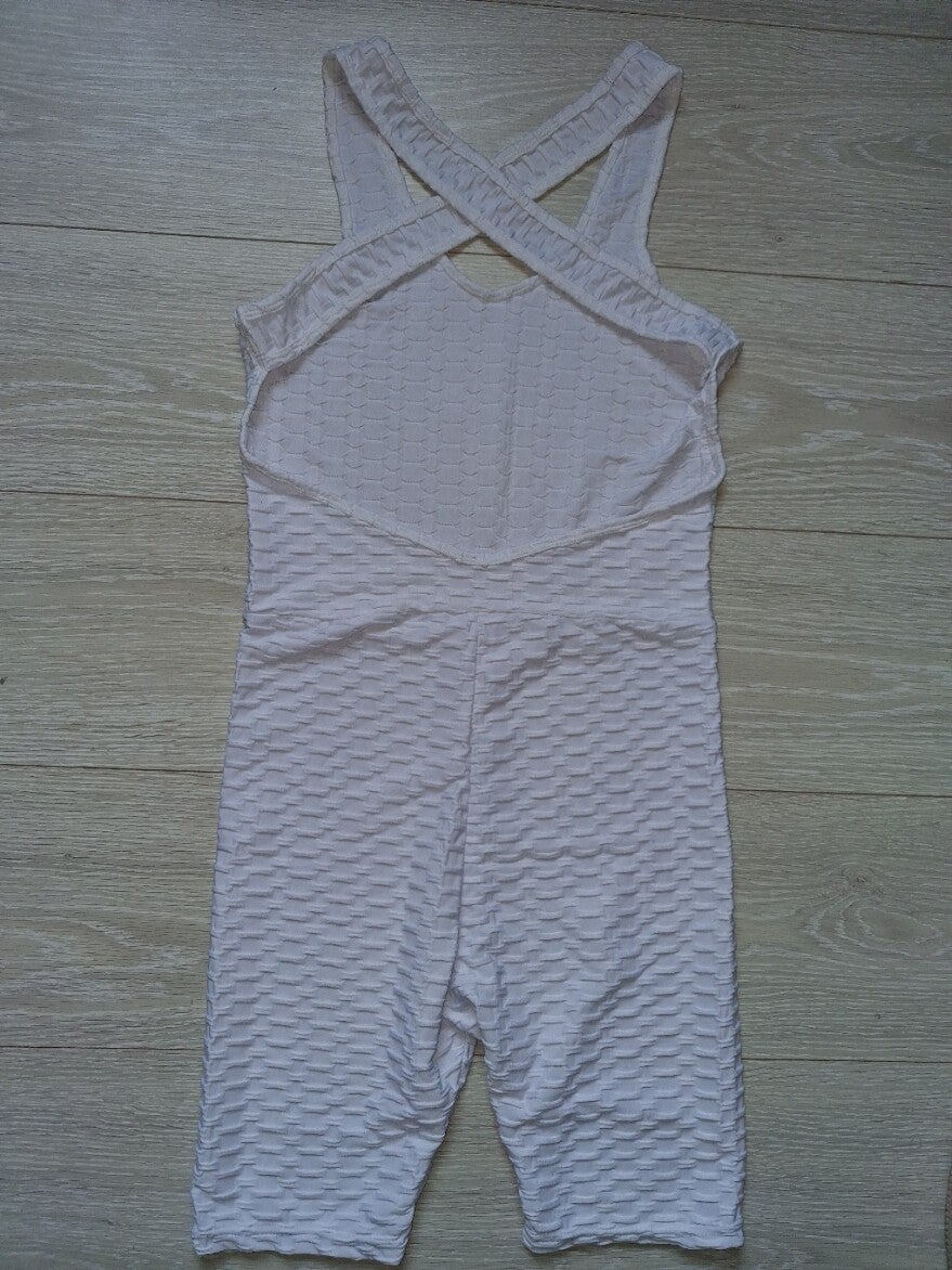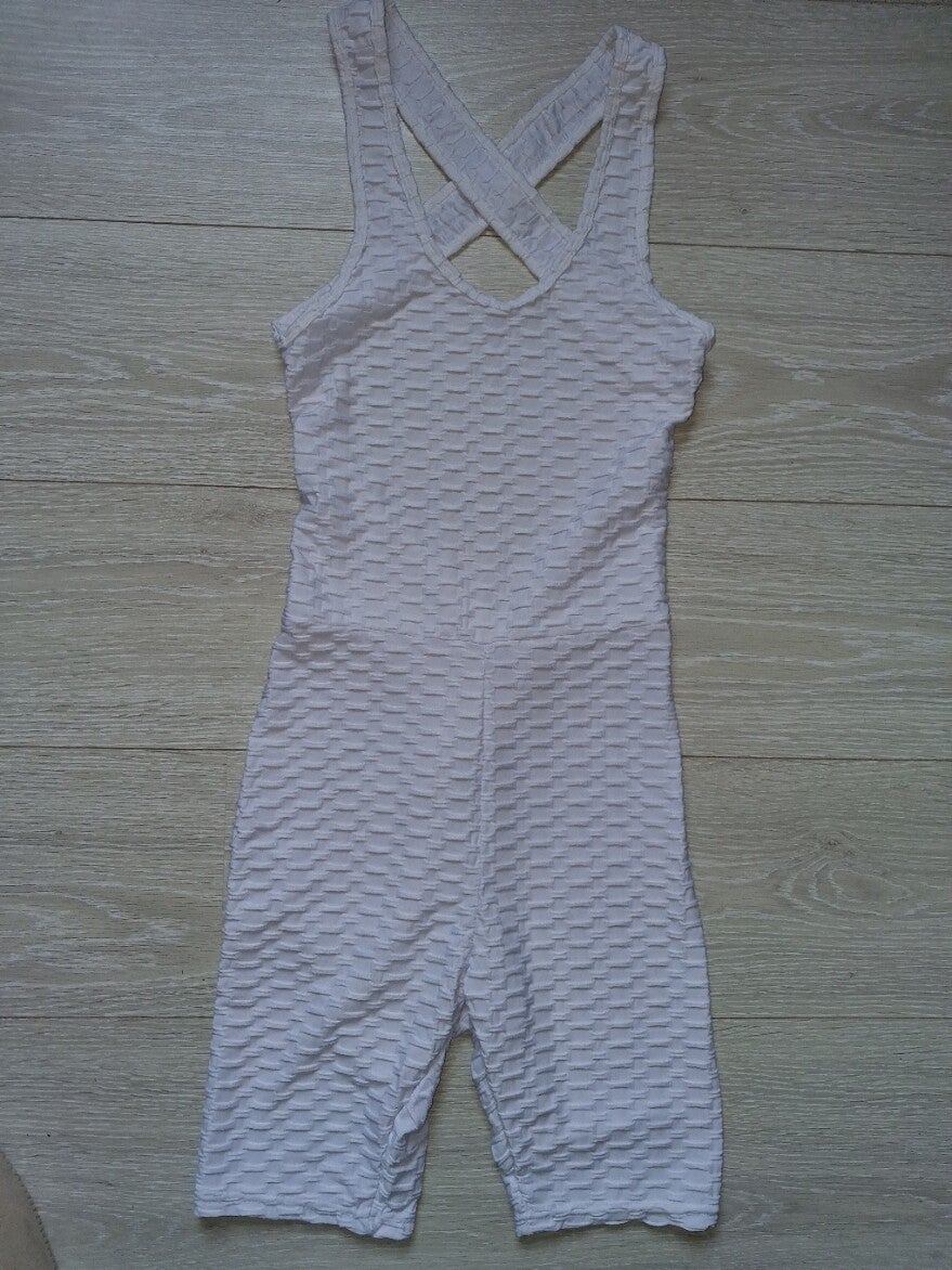 zo goed als nieuw. Deze playsuit heeft een gestructureerd wafelpatroon en een cross-back ontwerp. De korte pijpen en mouwloze stijl maken het een comfortabel kledingstuk. Playsuit cashual / sport veel stretch comfortable kleur wit gekruiste brede banden op de rug 85% polyamide en 15% elasthan maat L/XL merk: Holala