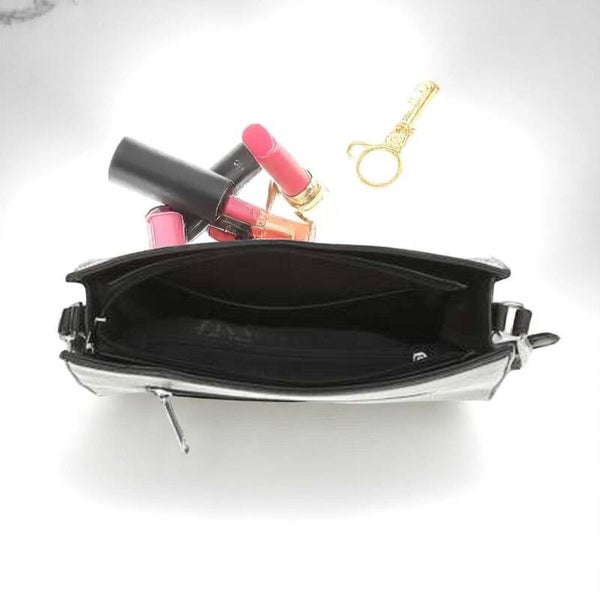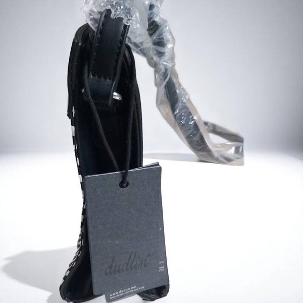 Schoudertas diagonaal patroon glimmend Lengte 29cm, Breedte 11cm, Hoogte 20cm, riem 60cm lekker ruim goed draagbaar Materiaal: Synthetisch in hoogwaardige lederlook 2 binnenzakken, waarvan 1 met ritssluiting ruimte voor telefoon buitenkant extra vak met ritssluiting Merk: Dudlin Kleur: zwart wit