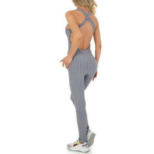 Jumpsuit kan zowel cashual als bij het sporten gedragen worden, en heeft aan de achterkant gekruiste brede banden kleur grijs 85% polyamide en 15% elasthan maat S/M merk: Holala