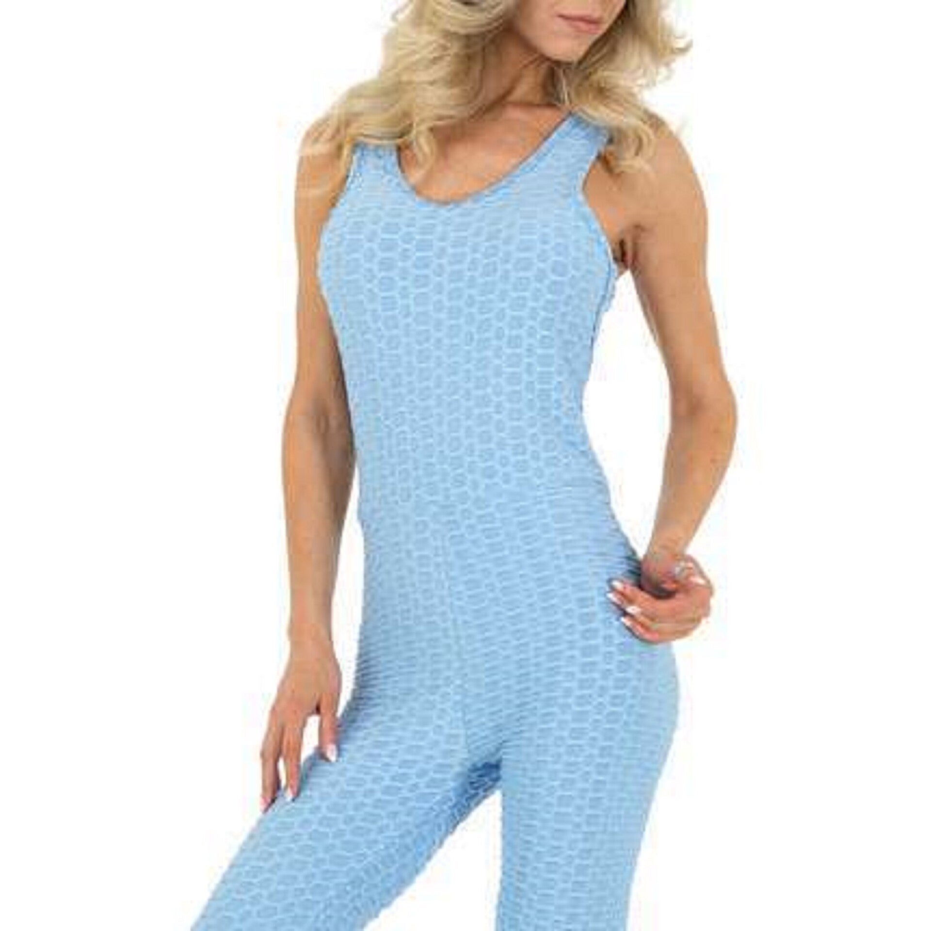 Jumpsuit kan zowel cashual als bij het sporten gedragen worden, en heeft aan de achterkant gekruiste brede banden kleur blauw maat L/XL 85% polyamide en 15% elasthan merk: Holala