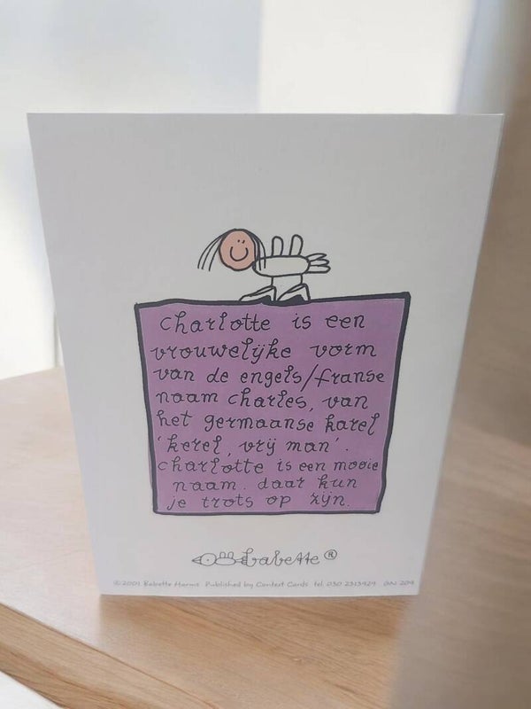 Dubbele post kaart met naam Charlotte met envelop. Ken jij iemand met de naam Charlotte verras deze persoon eens. Er is niet leukers dan het krijgen van eenkaartje. Geboortekaartjes die Babette Harms voor ons ontwierp. Deze lieve, handgetekende kaartjes zijn goed te herkennen aan de eigen stijl van Babette Harms.