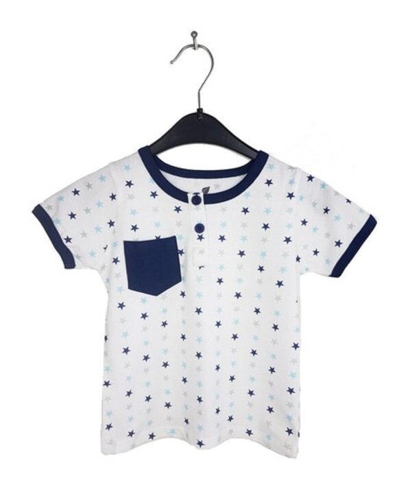T-shirt wit licht blauw donkerblauw met ronde hals, een borstzakje en knoopjes. Dit shirt heeft een sterren patroon. En is in maat 18-24 mnd 86/92, geslacht: jongens 100% katoen.