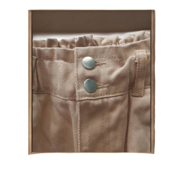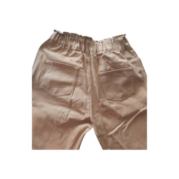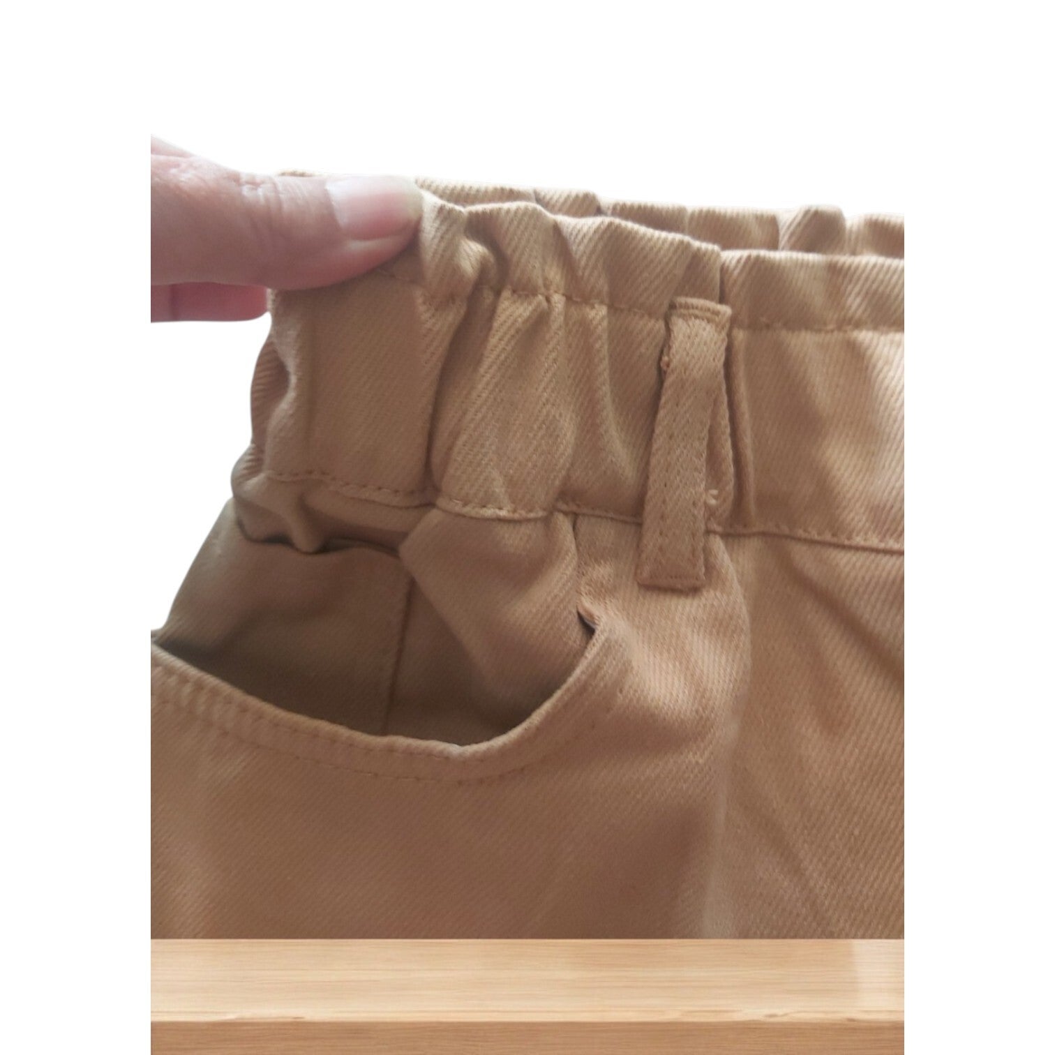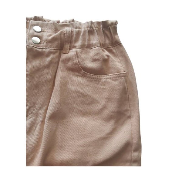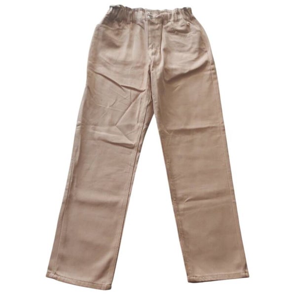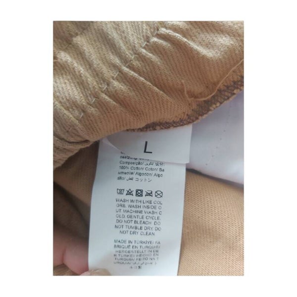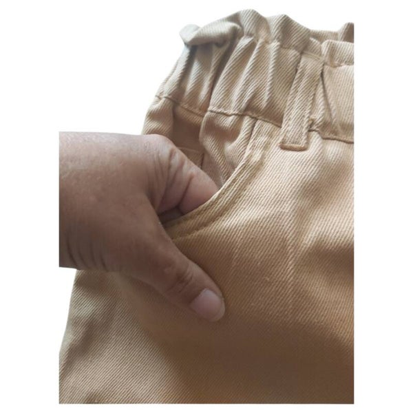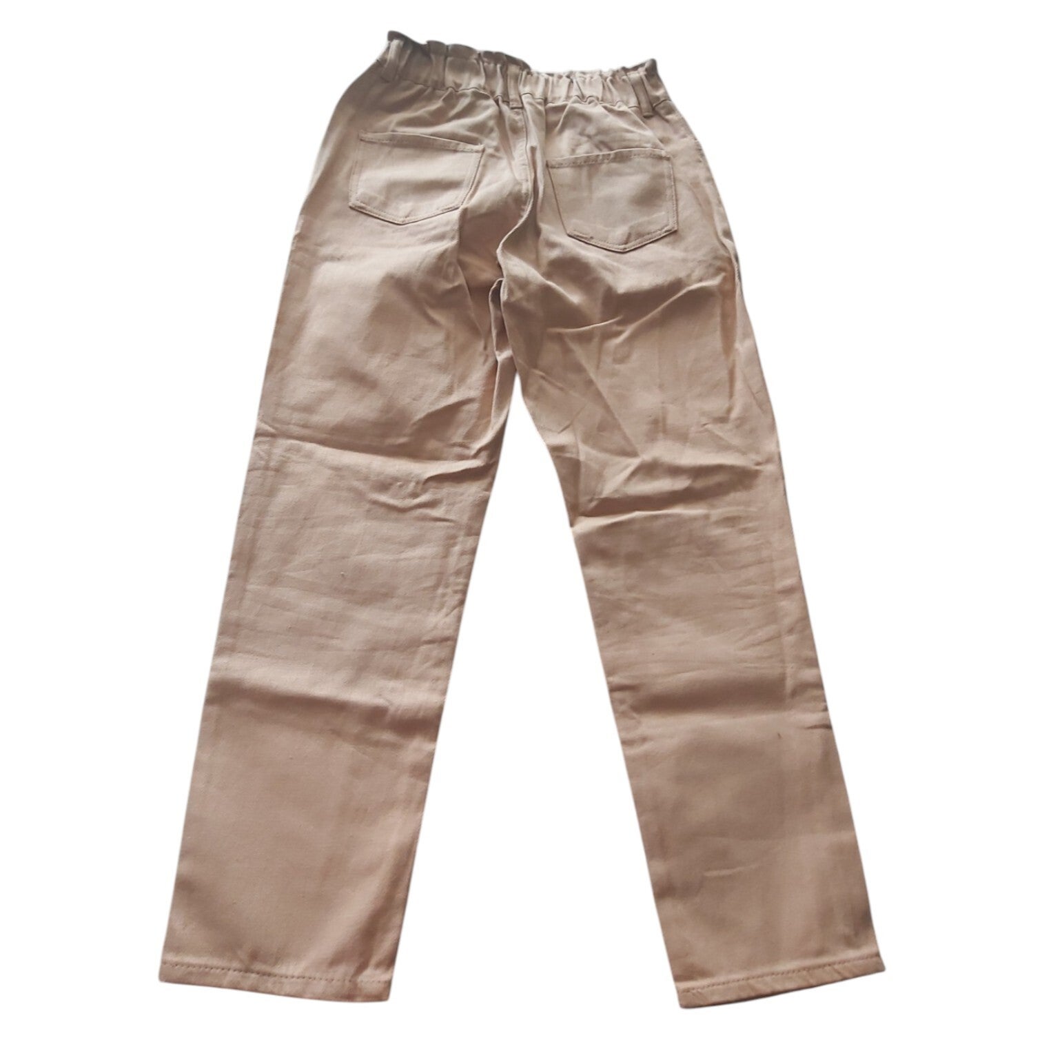 Jeans met insteekzakken en kontzakken , dubbele knoopssluiting en een ritssluiting maat L afmetingen plat gemeten: elastische tailleband taille 36-47cm heupen 53cm binnenbeen lengte 69cm totale lengte 101cm.