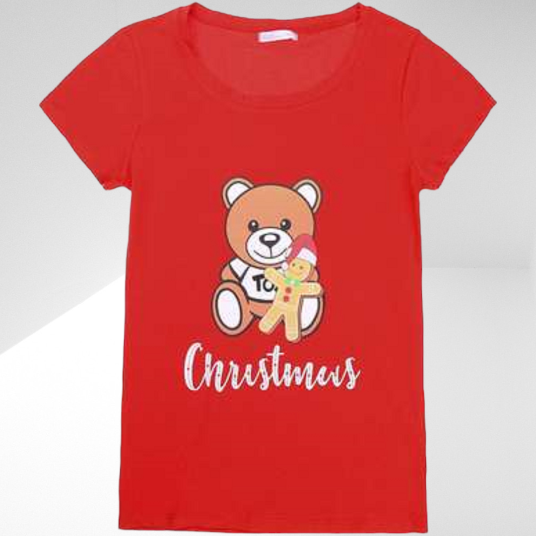 T-shirt getaileerd kerst beer rood bruin wit 95% katoen 5% elsthane met stretch maat M plat gemeten: oksel: 42.5cm lengte: 64cm schouder: 36cm merk: Glo-story