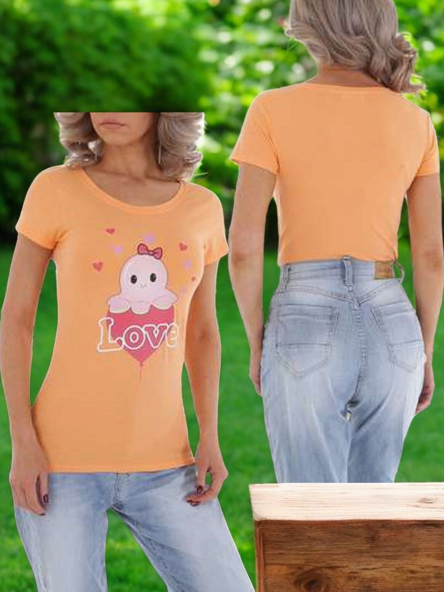 T-shirt strak getailleerd octopus love oranje roze rood geel paars zwart 95% katoen 5% elsthane met stretch Maat S plat gemeten: oksel: 39cm lengte: 62cm schouder: 35cm.
