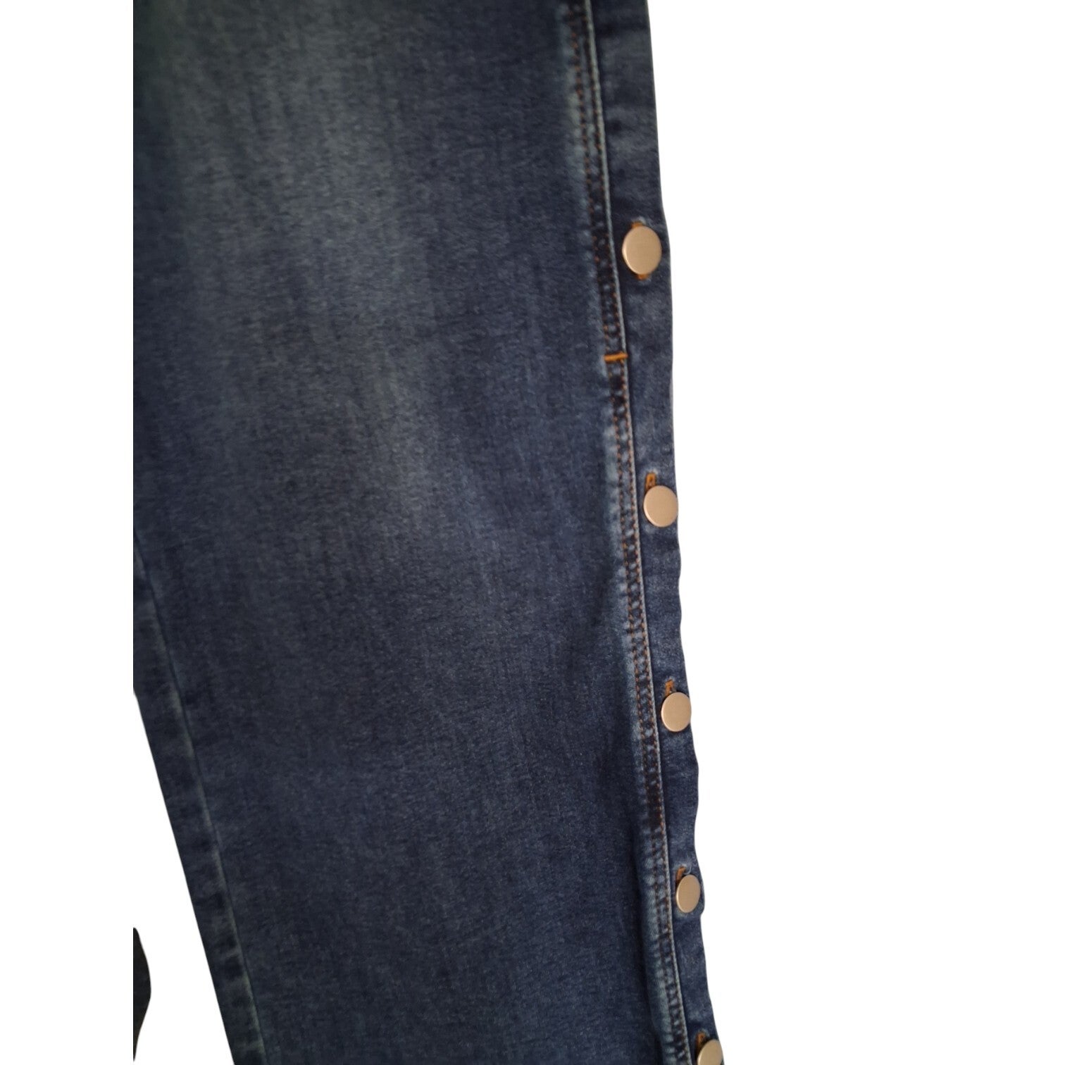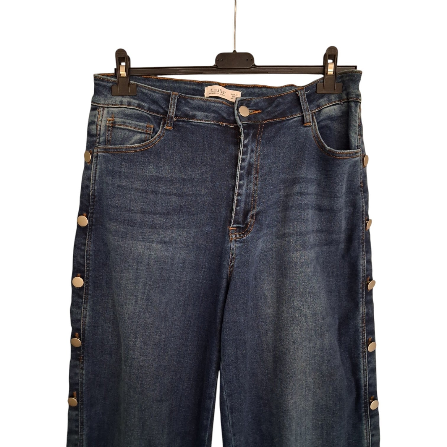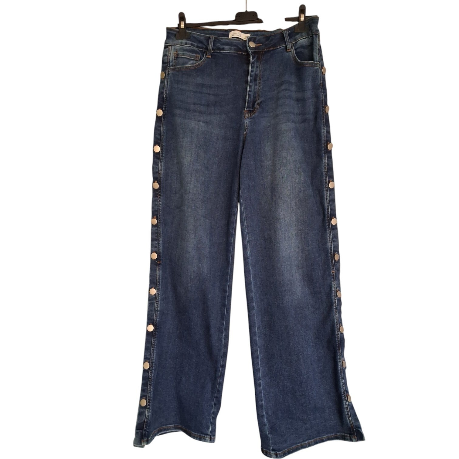 Stoere jeans met hoge taille, met relaxte pasvorm, dankzij de stretch die deze jeans bevat. Materiaal 54% katoen, 31% polyester, 2% viscose, 3% elastaan. Knoopsluiting met optische details. Fit broek losse pasvorm. Tailleband met hoge taille. Sluitingsknopen, ritssluiting. Taille is rekbaar taille rekbaar 41-55cn heup rekbaar 54-68cm. Kleur blauw