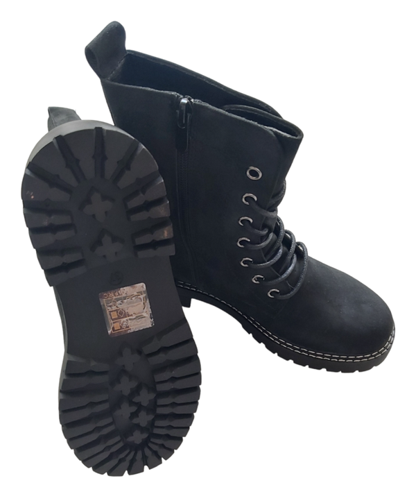 Enkellaarzen zwart suede wit stiksel onderaan de schoen maat 37 ritssluiting binnenzijde aanrijgveters lengte incl hak 22.5cm zoolhoogte 4.5cm. Super Mode