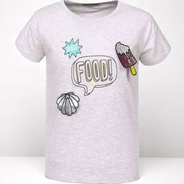 T-shirt hello food glitter ijs glitter schelp kleur grijs blauw zilver geel zwart maat 140 Afm plat neergelegd gemeten: oksel 41cm lengte 52cm schouder 42.5cm 100% katoen