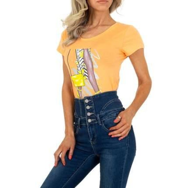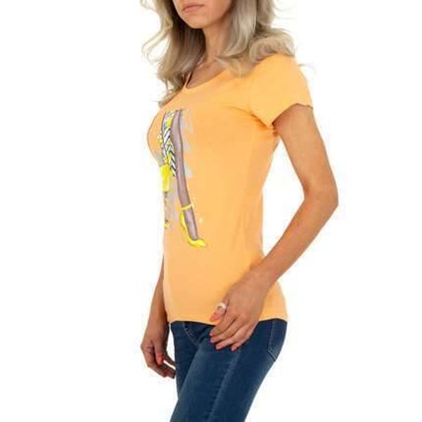 T-shirt strak getaileerd fashion hakken en tas glitter oranje geel wit zwart 95% katoen 5% elsthane met stretch maat M plat gemeten oksel: 44cm lengte: 62cm schouder: 37cm