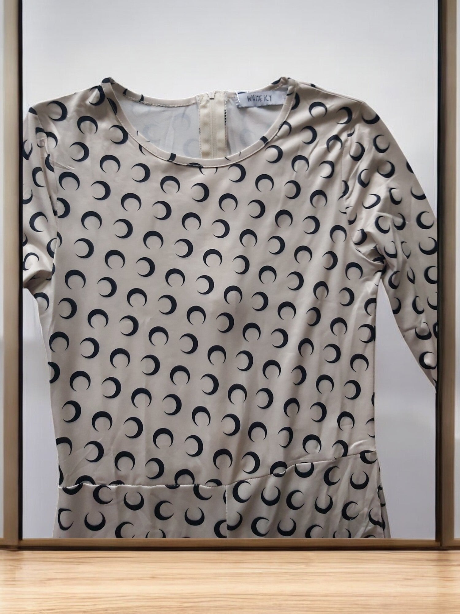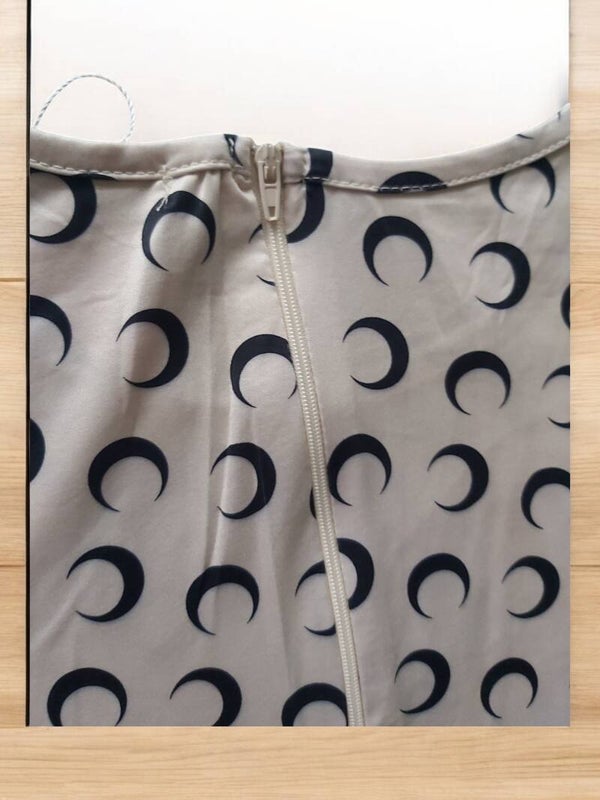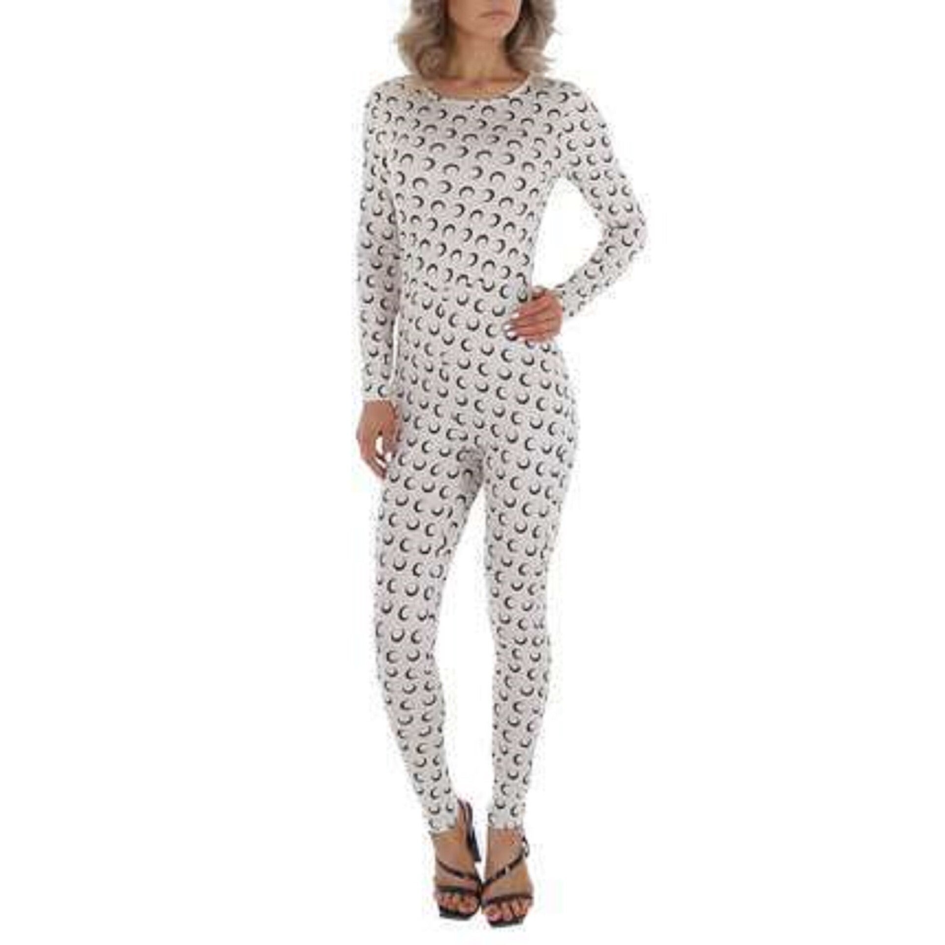 Comfortable jumpsuit creme zwarte halve maantjes lange mouwen ritssluiting aan de achterzijde halverwege de rug tot in de nek ronde hals 95% Polyester, 5% Elasthan/Spandex Maat S/36 afmetingen plat gemeten , zonder te stretchen. armlengte 57cm binnenkant been 69.5cm oksel 38.5cm totale lengte 140cm schouder 35cm merk: White icy