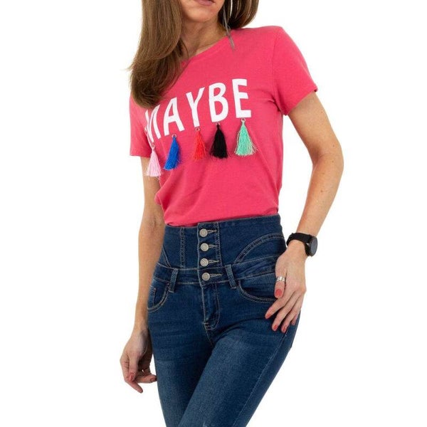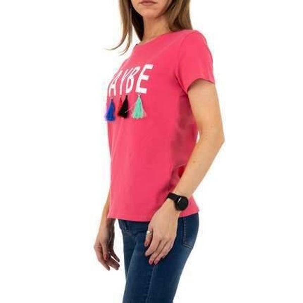 T-shirt gekleurde kwastjes tekst "mayby" ronde hals korte mouwen kleuren roze meer kleurig 95% katoen 5% elasthane met stretch Maat XL plat gemeten: Schouder 40.5cm Lengte 68cm Oksel 52cm Merk: Glo-story