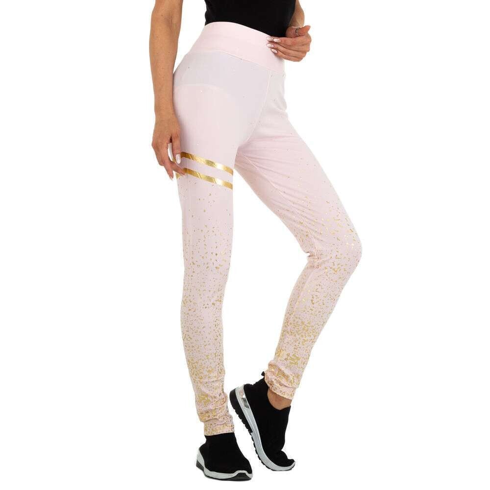 Stretch broek / legging voor zowel cashual als sport , elastische tailleband blind elastiek lichtroze goud glitter 95% polyester 5% elasthane maat L/XL afmetingen plat gemeten: taille rekbaar 33-53cm lengte 99cm