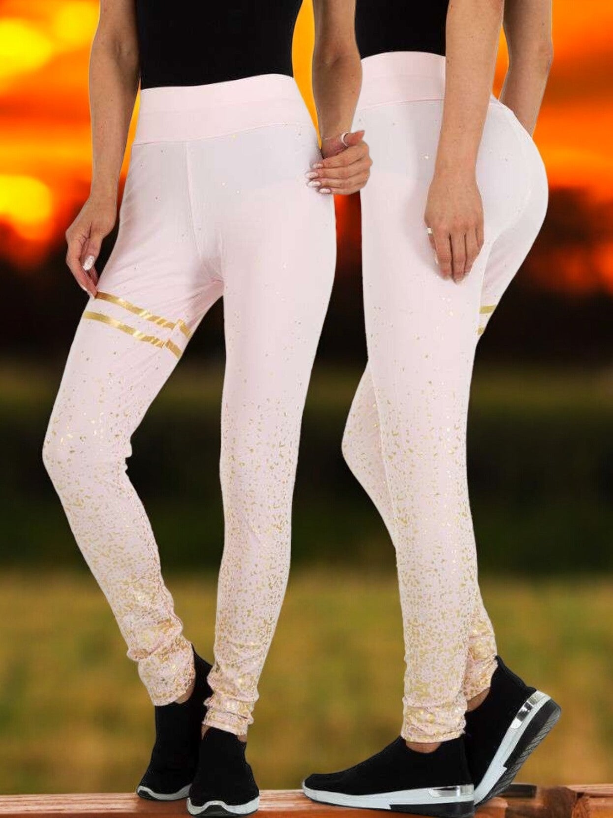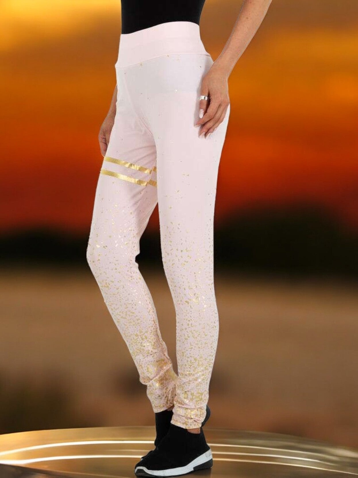 Pantalons/leggings extensibles pour les activités décontractées et sportives, ceinture élastique, élastique aveugle, rose clair, paillettes dorées, 95 % polyester, 5 % élasthanne, taille L/XL. Mesures mesurées à plat : taille extensible 33-53 cm, longueur 99 cm. Marque : Holala poids 186 grammes
