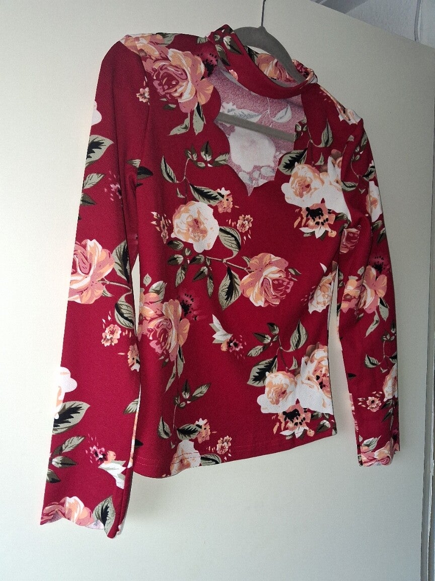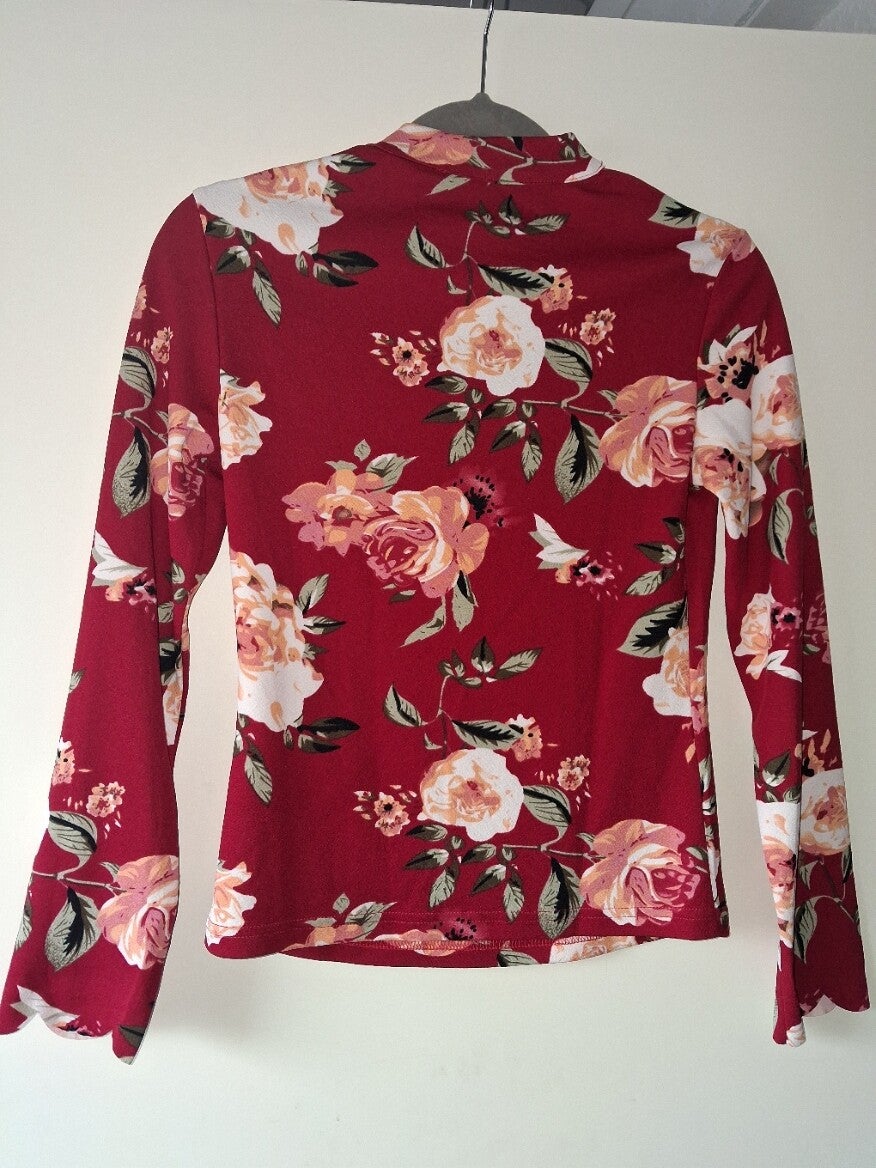 Weinig gedragen. Stetchy top lange mouwen, bloemen print met rondingen hals koord maat M oksel 41cm schouder 37.5cm lengte 58cm 95%polyester 5%spandex met stretch