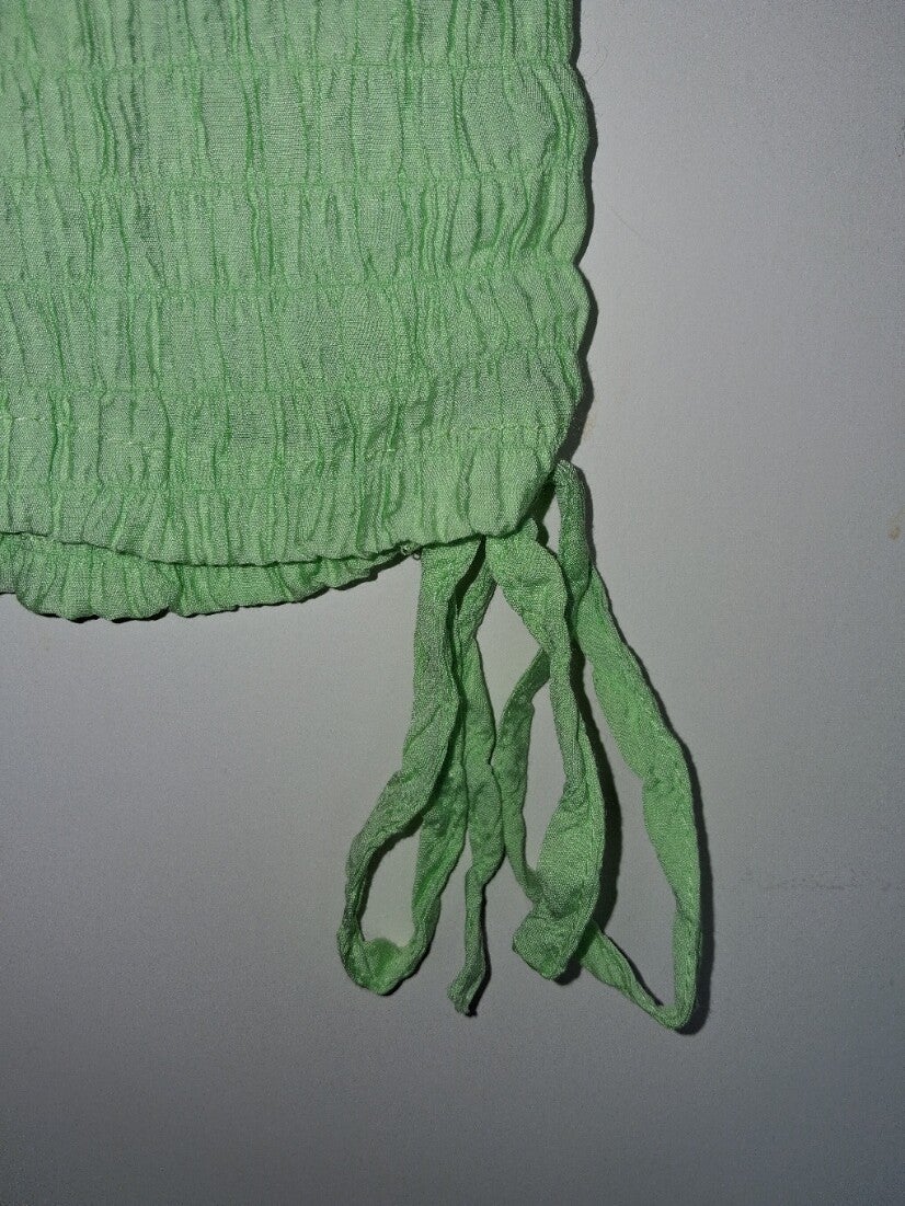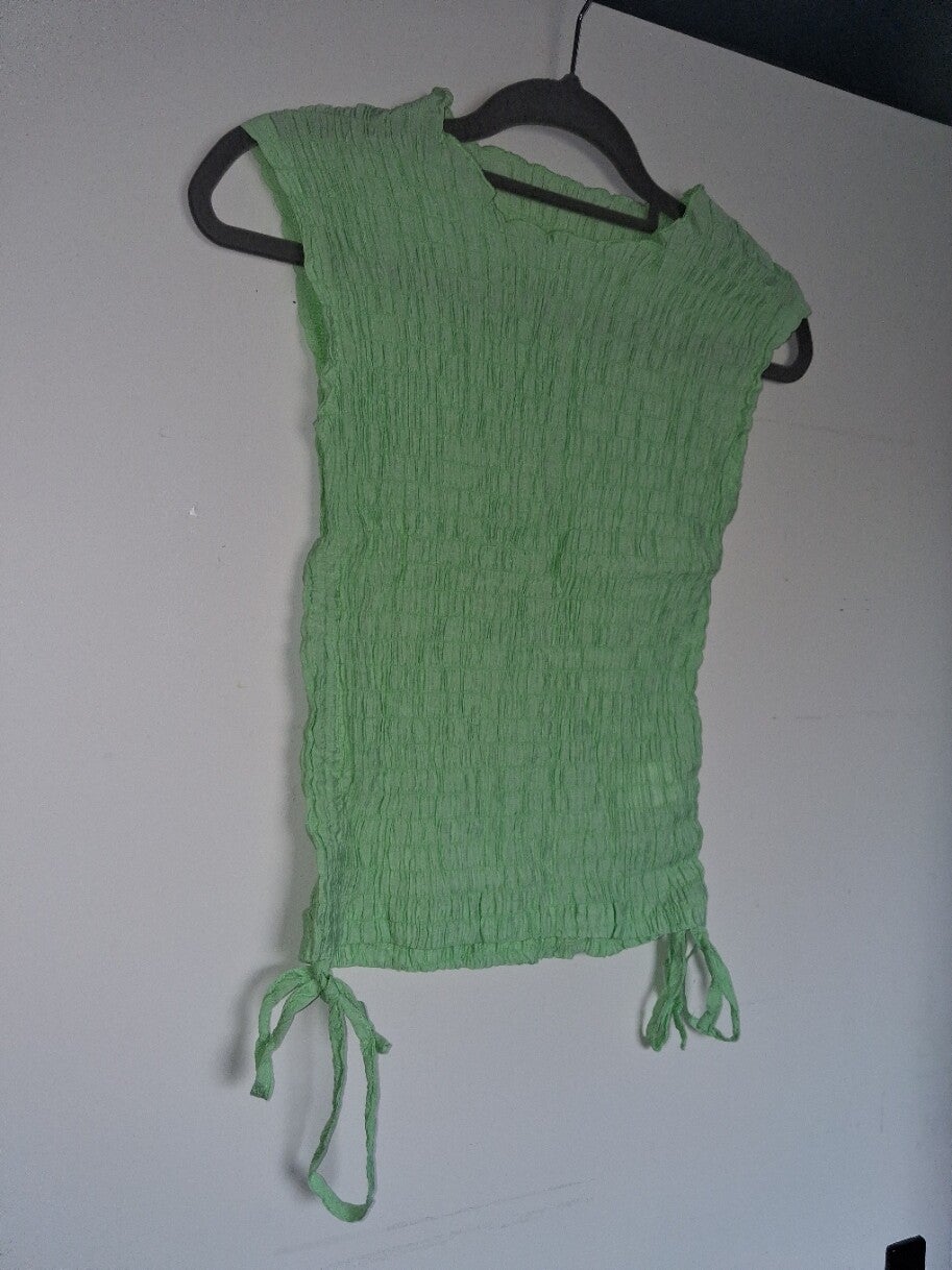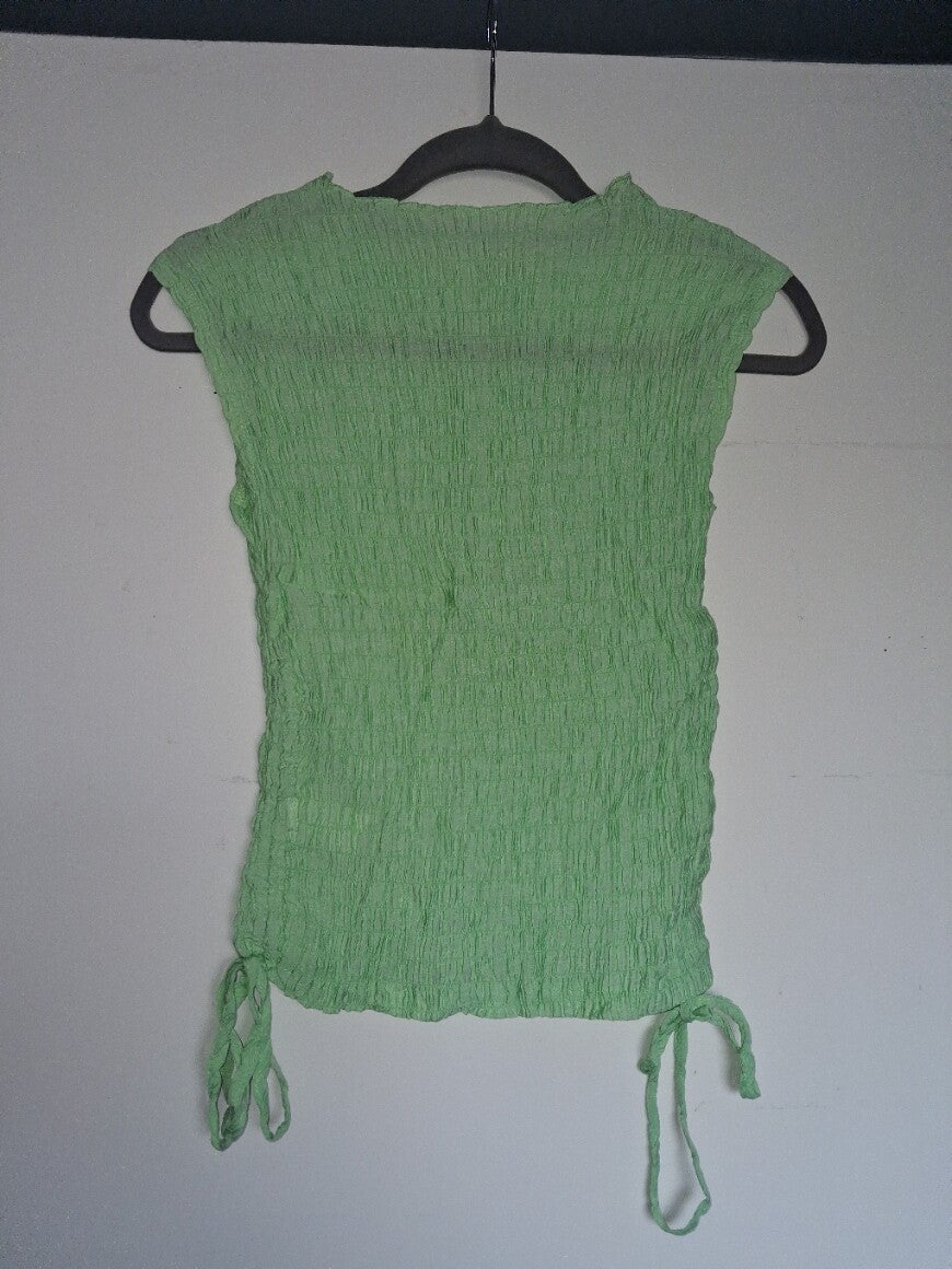 Mouwloze top met een gerimpeld textuur over het hele kledingstuk. De top heeft een ronde halslijn en aan de onderkant zitten aan beide zijkanten trekkoorden die gestrikt kunnen worden. Ook erg leuk boven badkleding te dragen. maat M. lengte 53cm 80% cotton 5% spandex 15% nylon