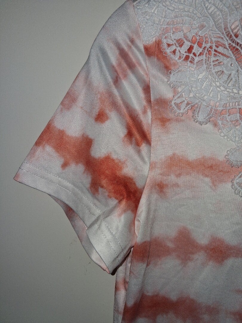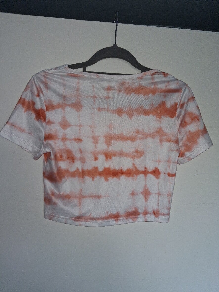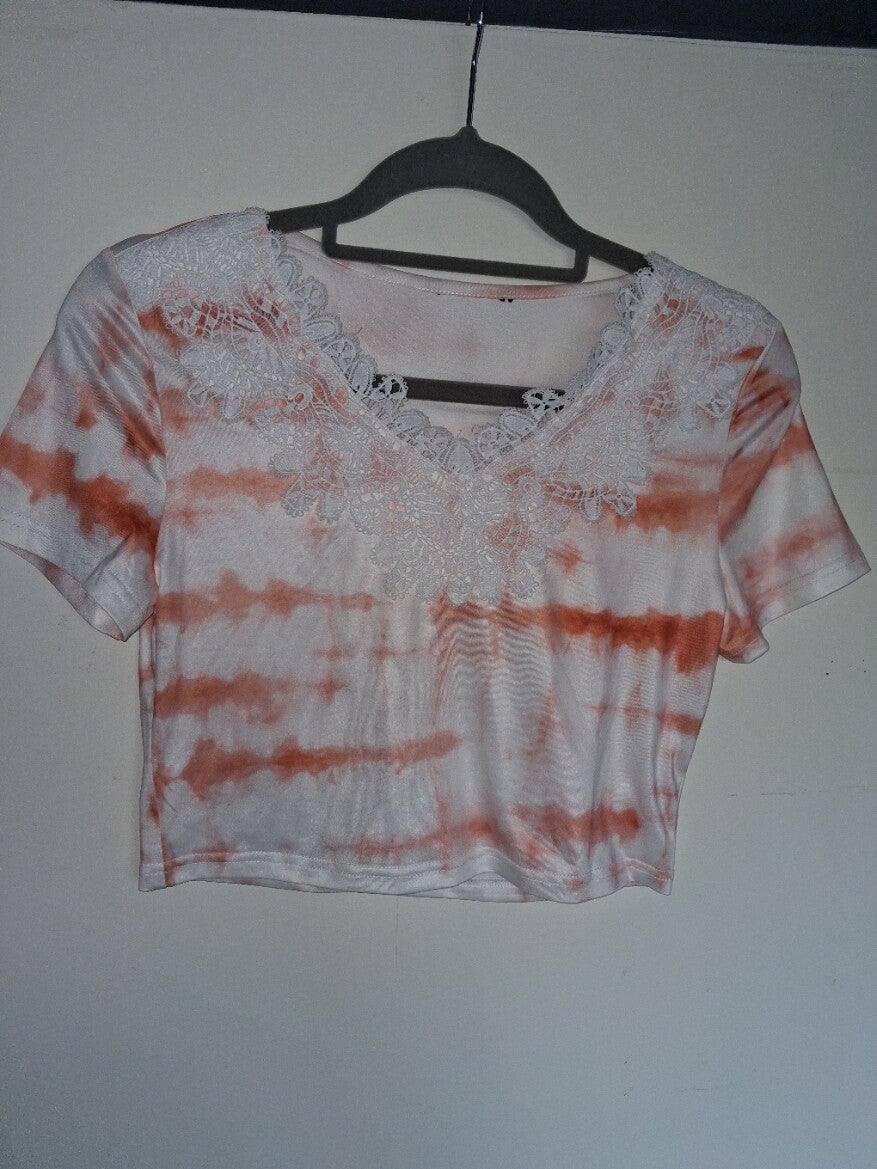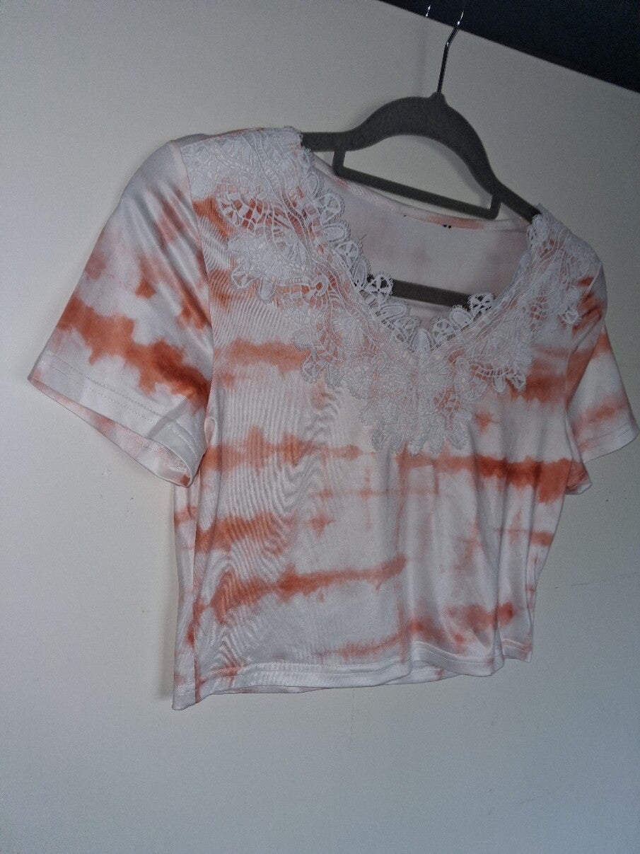 Crop top met korte mouwen en een opvallend tie-dye patroon in wit en oranje. De top heeft een V-halslijn versierd met wit kantwerk, wat een delicate touch geeft aan het trendy design. De zoom is recht en de pasvorm is aansluitend. maat M oksel 53cm schouder 36cm lengte 42cm met stretch was/maat label ontbreekt