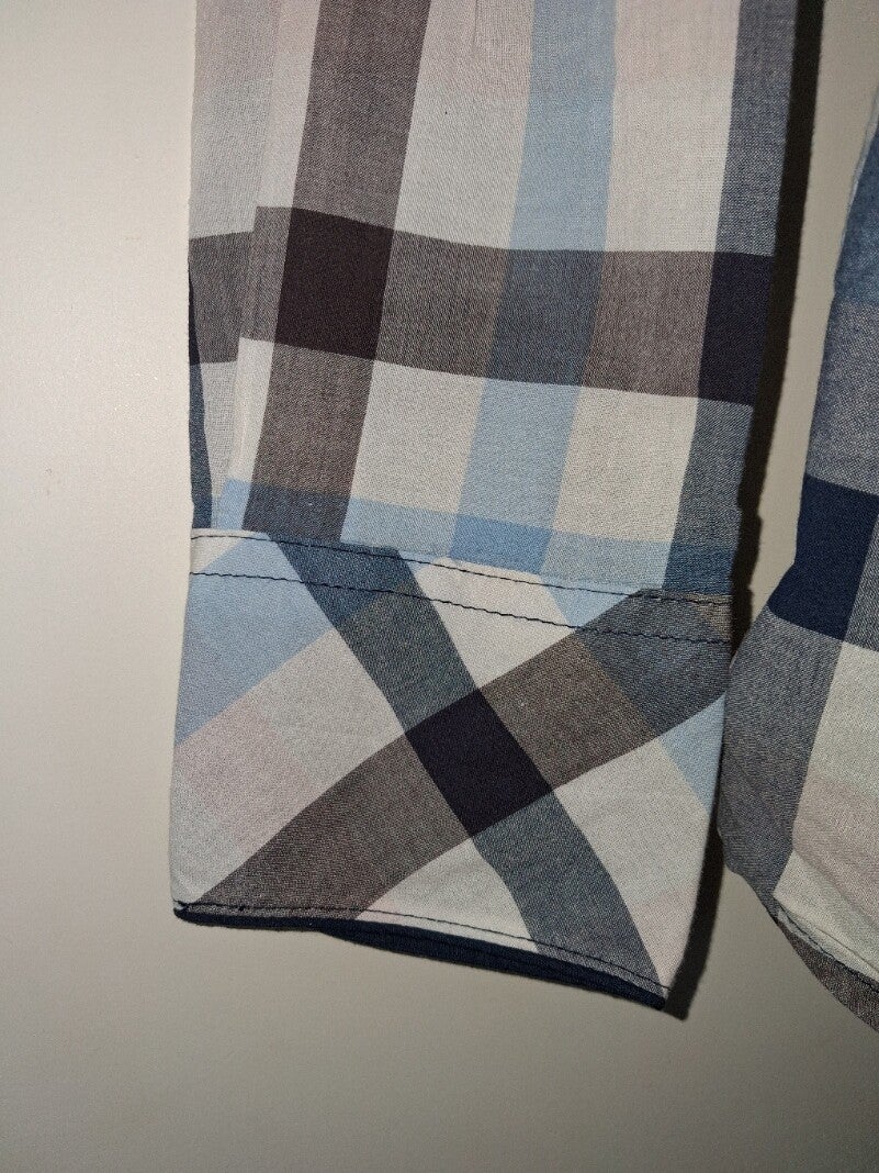 Weinig gedragen. Overhemd geruit blauw lichtblauw wit met knoopssluiting borstzakjes maat 40 oksel 51cm schouder 36cm lengte 66cm. Merk John Baner