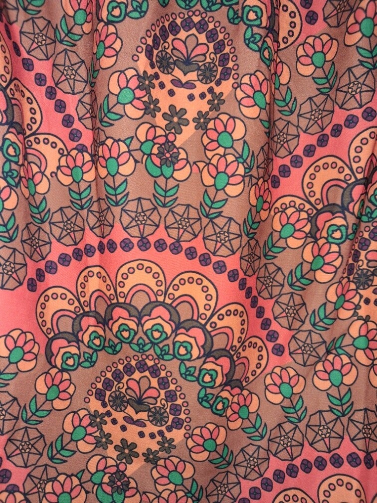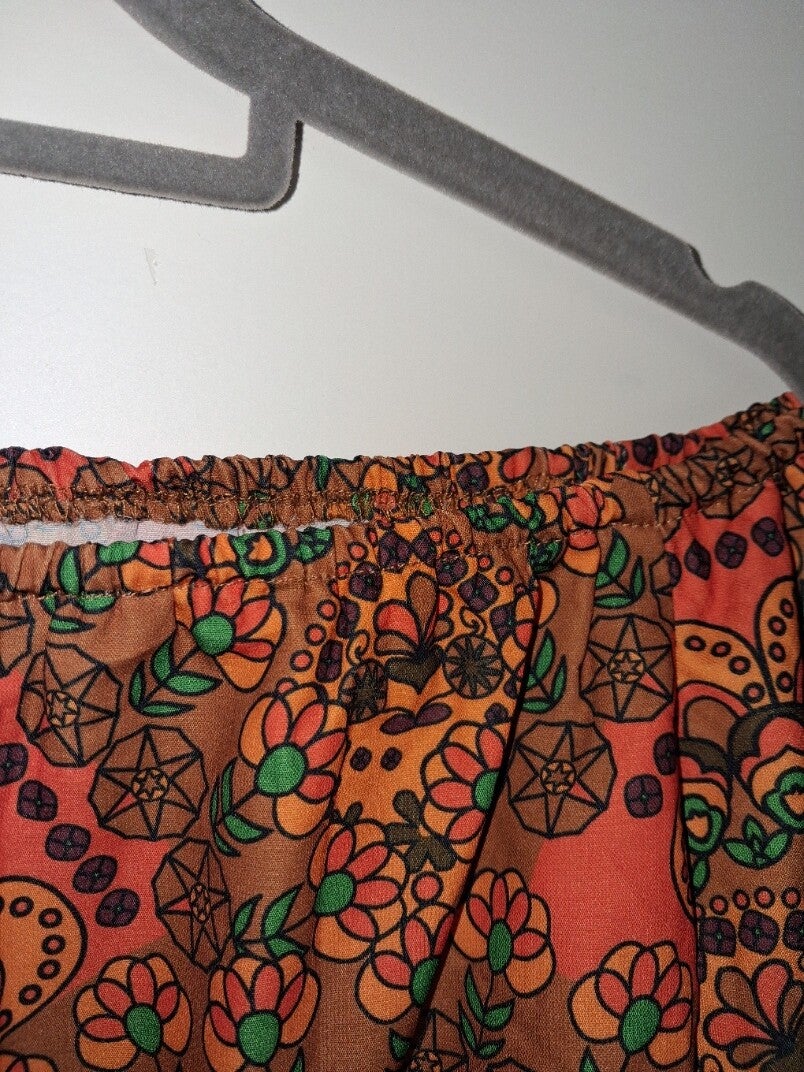 Deze off-shoulder top heeft een levendig patroon met bloemmotieven en geometrische vormen in warme tinten. De top is voorzien van gelaagde ruches aan de mouwen, wat zorgt voor een speels en volumineus effect. De elastische halslijn zorgt voor een comfortabele pasvorm en benadrukt de schouders. maat M oksel 47cm 100% polyester