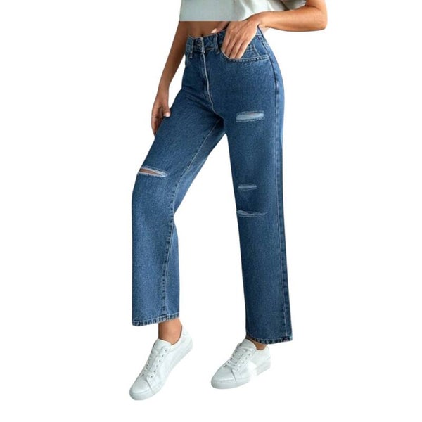 Jeans ripped blauw insteekzakken en kontzakken merk miss kubra maat M/31 afmetingen plat gemeten taille 40cm heup 52cm binnenbeen lengte 73cm totale lengte 101cm.