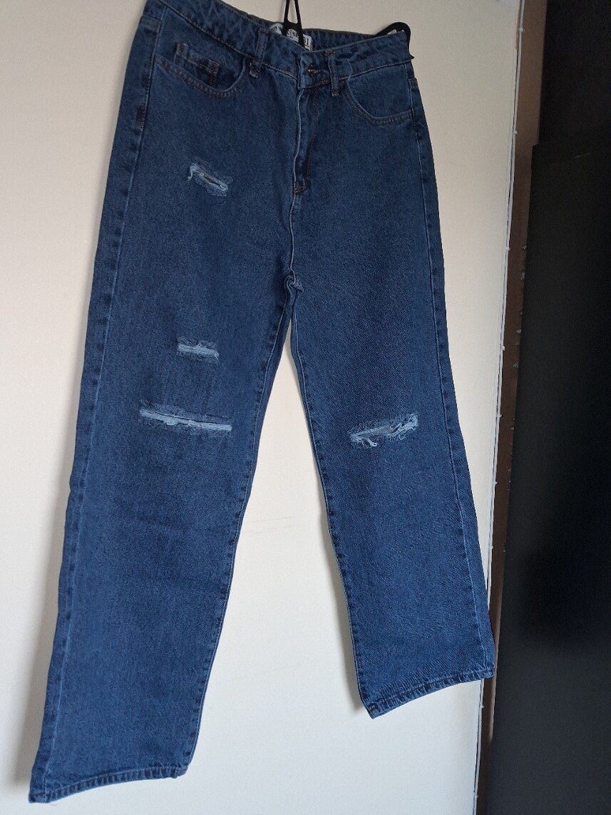 Deze spijkerbroek heeft een trendy ontwerp met distressed details. De broek heeft een hoge taille en een wijde pijp, wat zorgt voor een comfortabele en stijlvolle pasvorm. De klassieke blauwe kleur maakt deze jeans veelzijdig en gemakkelijk te combineren met verschillende tops en schoenen. De broek is voorzien van zakken aan de voor- en achterkant en sluit met een knoop en rits. maat M/31 afmetingen plat gemeten taille 40cm heup 52cm binnenbeen lengte 73cm totale lengte 101cm.