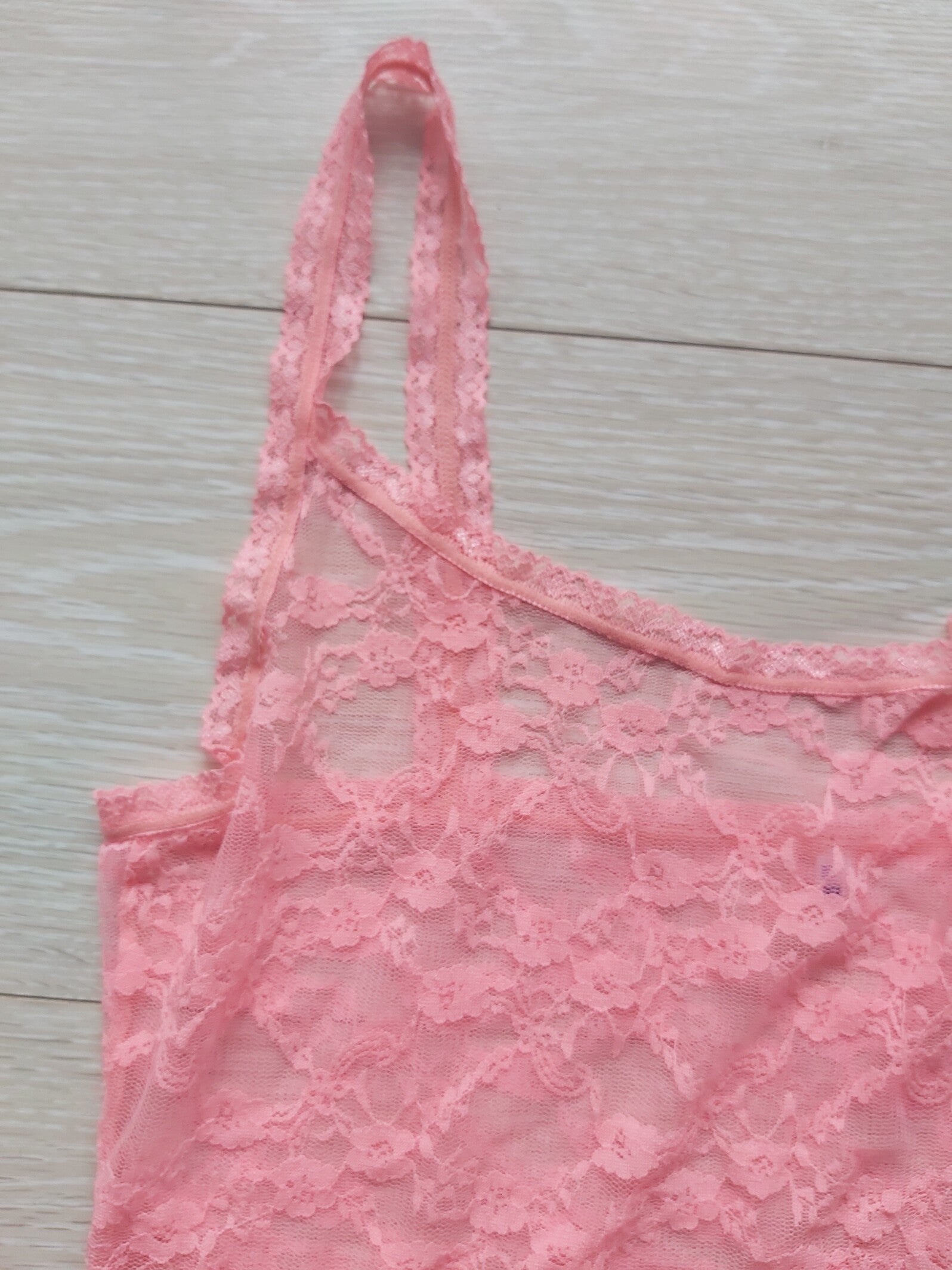 Kanten doorschijnende top zalmroze kleur het label geeft aan XL, maar valt als een maat M oksel 40cm lengte 67cm