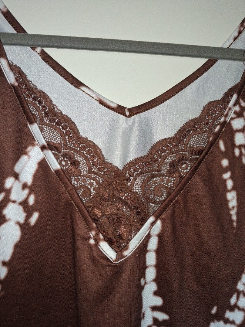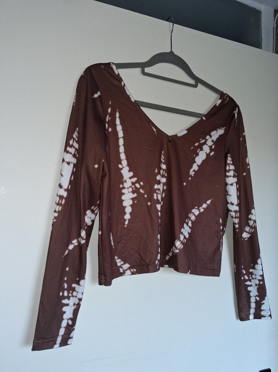 Weinig gedragen. Crop top met v hals en kant. Deze bruin witte croptop heeft lange mouwen. maat M oksel 43,5cm schouder 34cm lengte 47,5cm. En is gemaakt van 95%polyester 5% spandex
