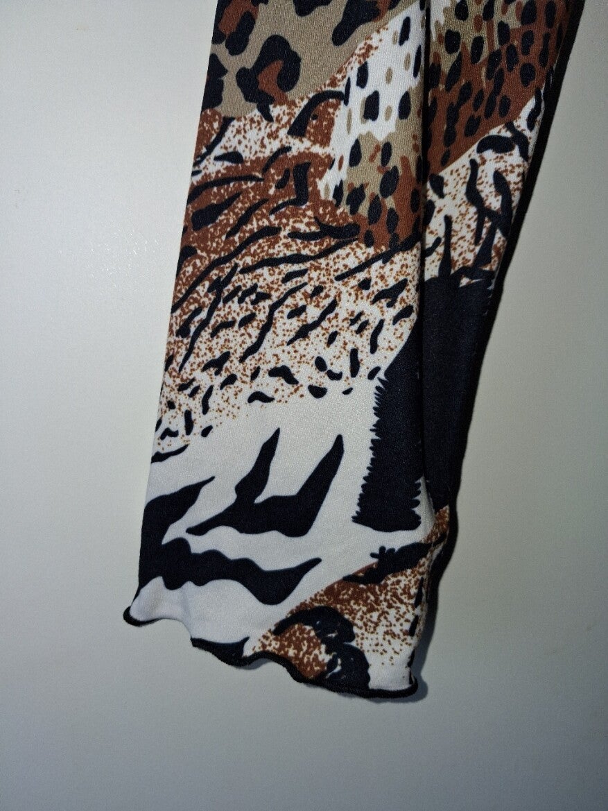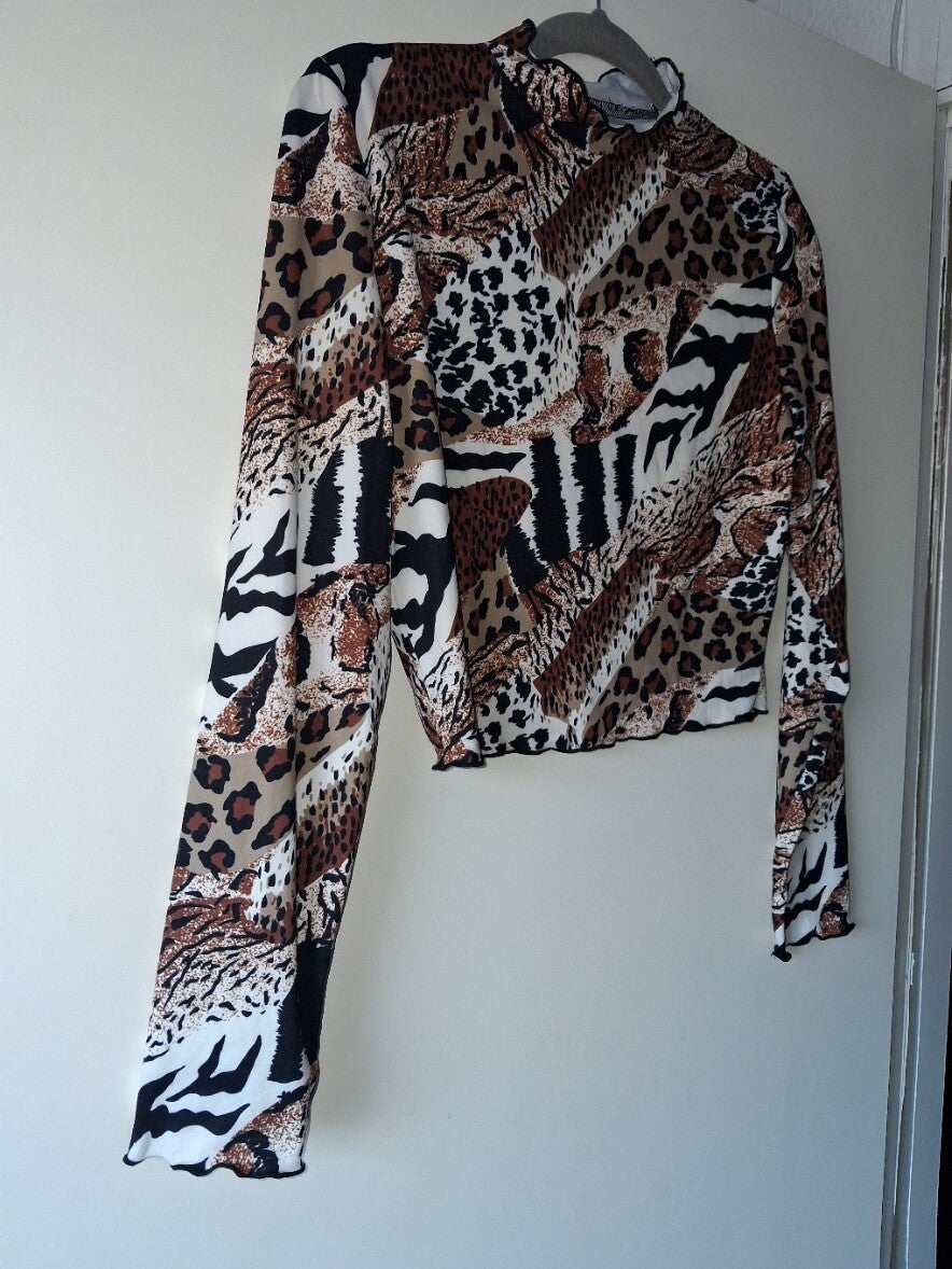 Weinig gedragen. Croptop lange mouwen met stretch in panter print mat gerulde randjes aan de boorden maat L oksel 45-60cm schouder 37,5cm lengte 45cm 92% polyester 2% spandex.