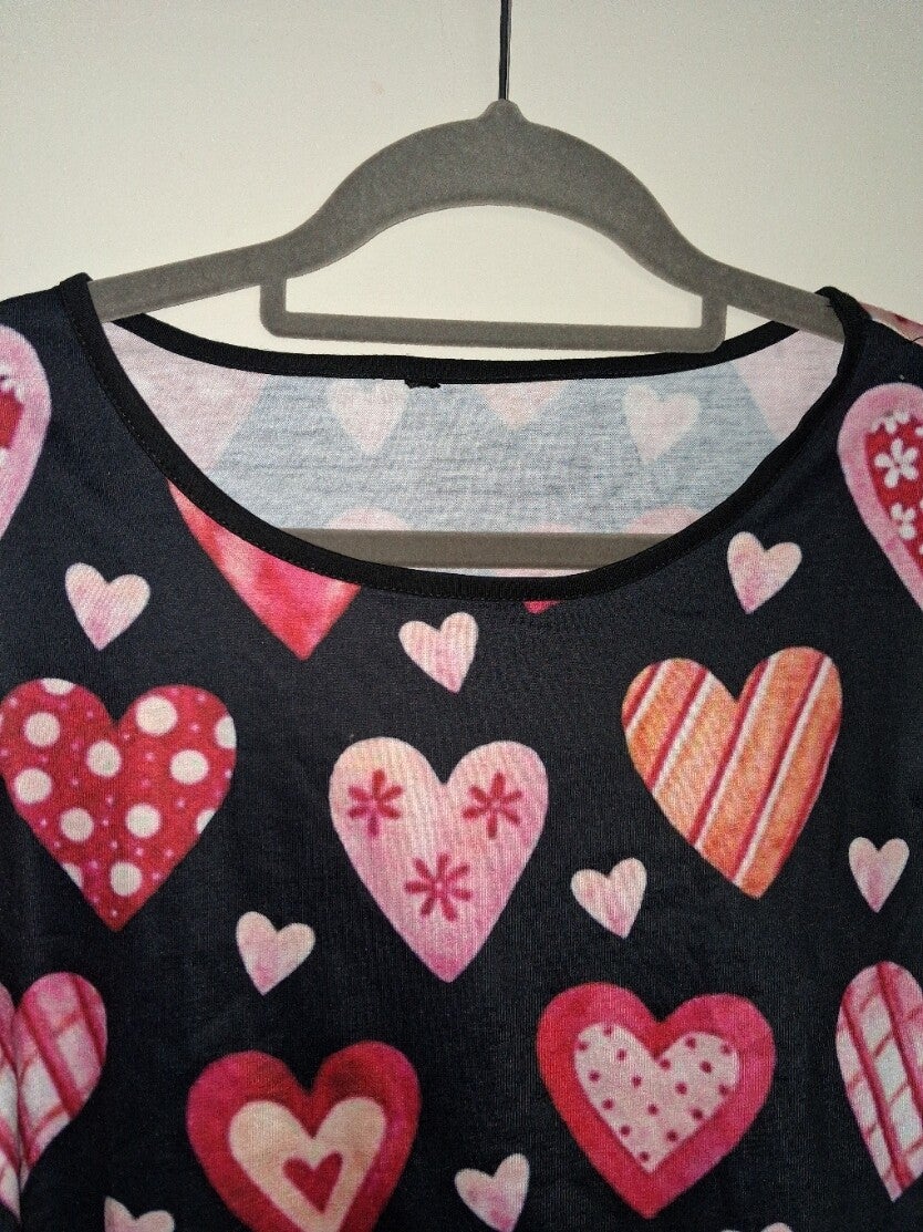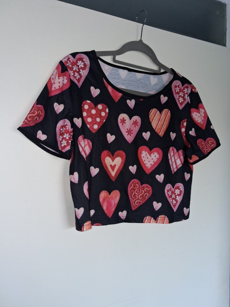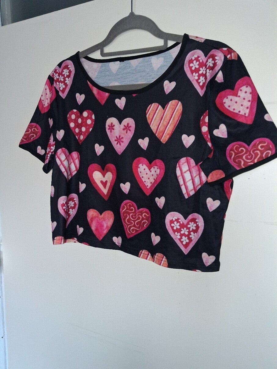 Deze crop top heeft korte mouwen en een ronde halslijn. De top is voorzien van een all-over print van harten in verschillende roze en rode tinten op een zwarte achtergrond. De harten hebben diverse patronen, zoals stippen, strepen en bloemmotieven. maat L zwart rood roze oksel 50cm schouder 41cm lengte 45cm