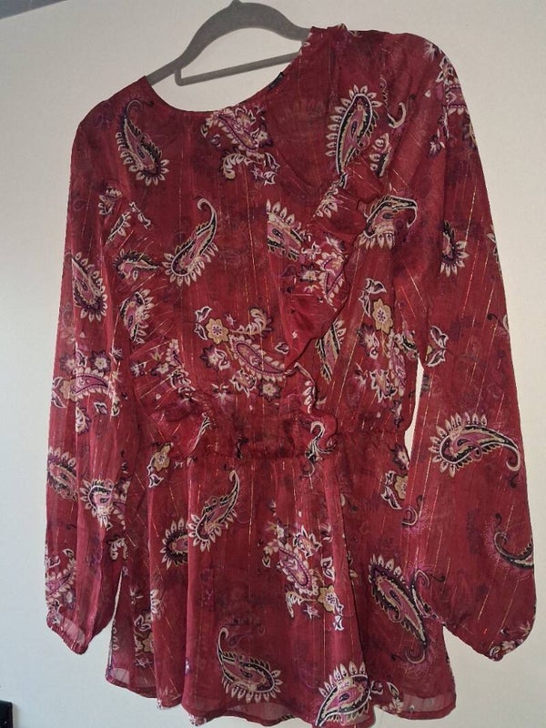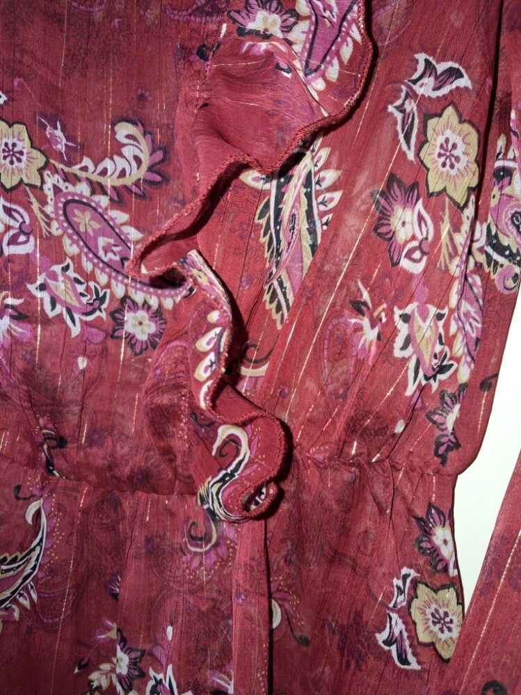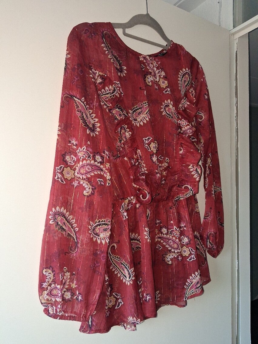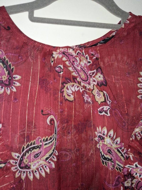 Weinig gedragen. Deze lichtdoorlatende blouse heeft lange mouwen en een ronde halslijn. De taille is geplooid en de blouse heeft een peplum-achtige zoom. Het patroon bestaat uit paisley-motieven in verschillende tinten rood, roze en beige, met verticale glanzende strepen. elastische taille met blind elastiek rekbaar 36-55cm materiaal onbekend maat L/40 oksel 53cm schouder 39cm lengte 73cm. Waslabel is eruit geknipt.