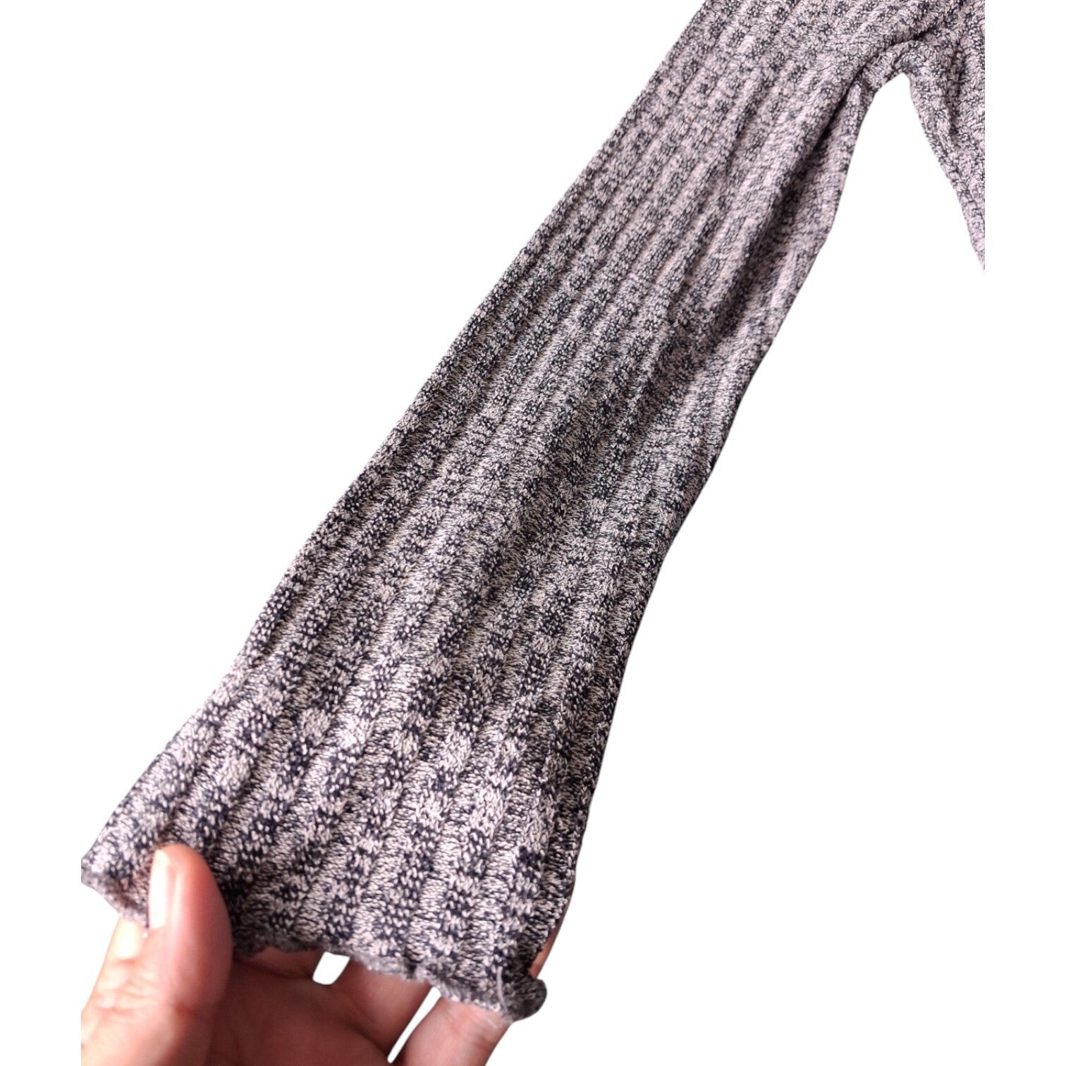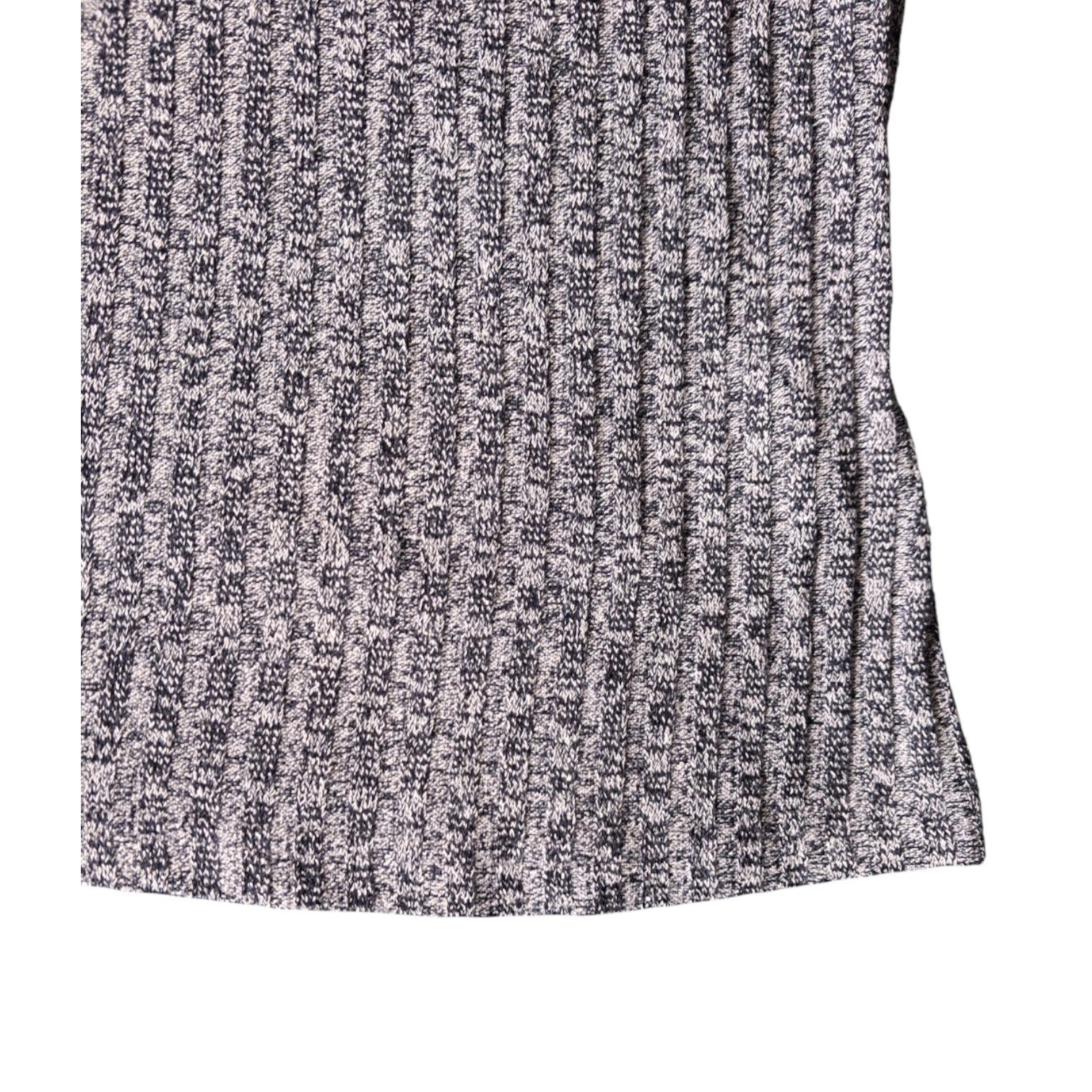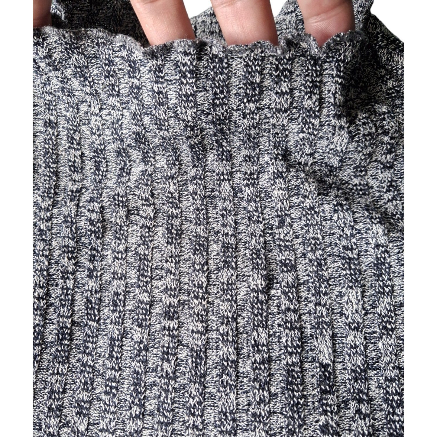Weinig gedragen. Deze trui heeft lange mouwen en een opstaande kraag met een golvende rand. De mouwen hebben ook een golvende afwerking aan de manchetten. De trui heeft een gemêleerd patroon in donkerblauw en wit, wat een subtiele textuur geeft aan het kledingstuk. Maat L oksel 47-62cm schouder 38cm lengte 57cm.