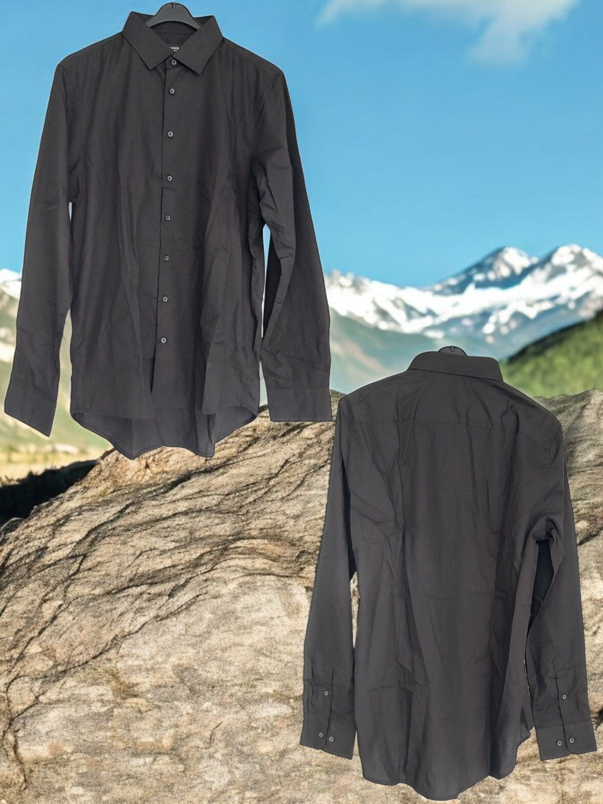 Chemise noire unie à manches longues modèle Slim Fit marque : Territoire du Nord-Ouest taille L 41/42, 55 % coton, 45 % polyamide, aisselles 55 cm, épaules 46 cm, longueur 80 cm