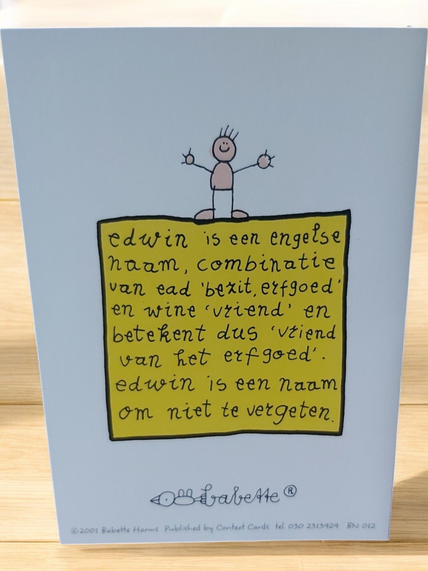 Dubbele post kaart met naam Edwin met envelop. Ken jij iemand met de naam Edwin, verras deze persoon eens. Er is niet leukers dan het krijgen van een kaartje. Geboortekaartjes die Babette Harms voor ons ontwierp. Deze lieve, handgetekende kaartjes zijn goed te herkennen aan de eigen stijl van Babette Harms.