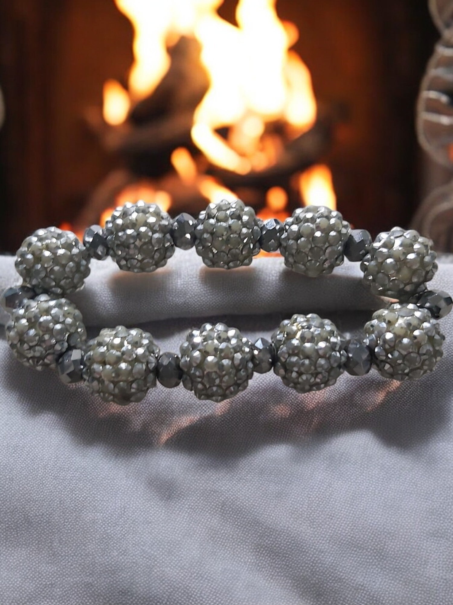 Ce bracelet est de couleur argentée et possède une bande élastique. Il ira donc bien. Les boules donnent une belle lueur dans la lumière du soir.