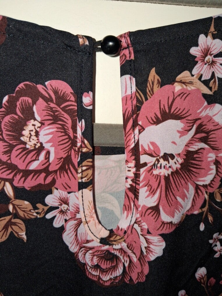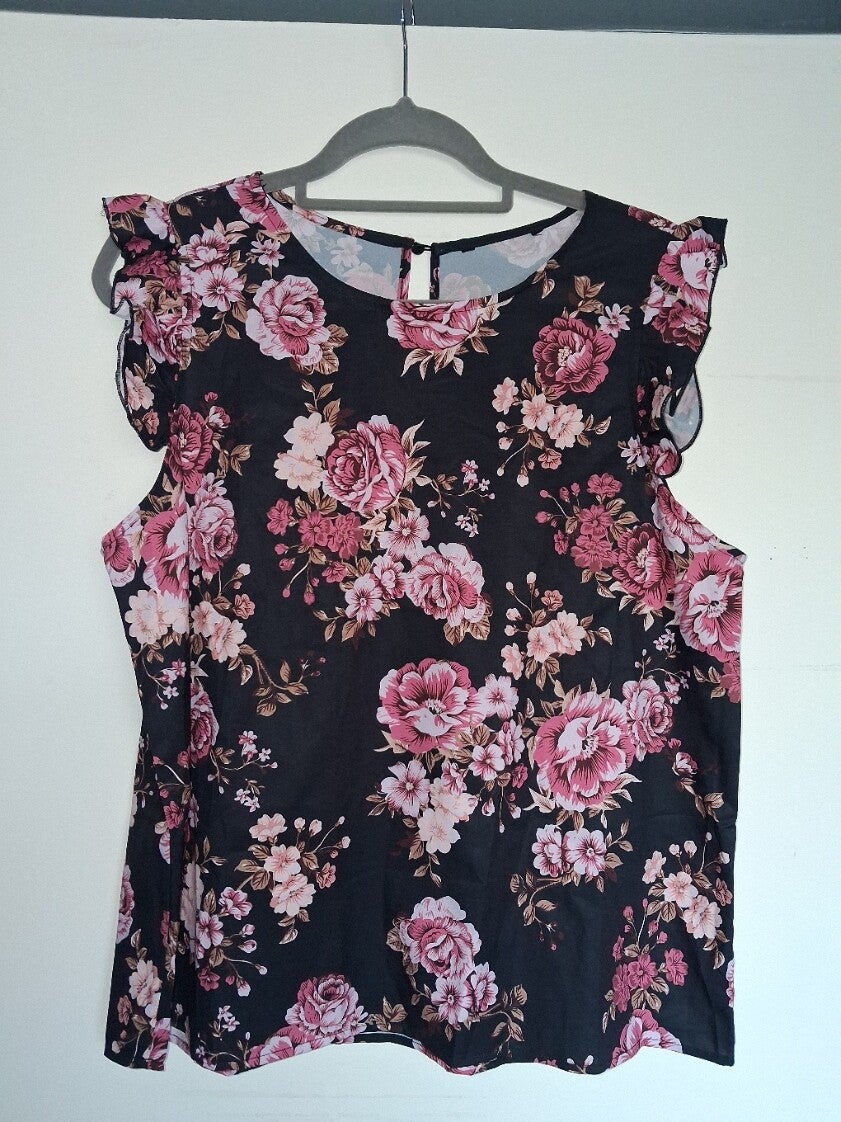 Mouwloze top met een ronde halslijn en een knoopsluiting aan de achterkant. De top heeft ruches op de schouders en een levendig bloemenpatroon over het hele oppervlak. maat L
