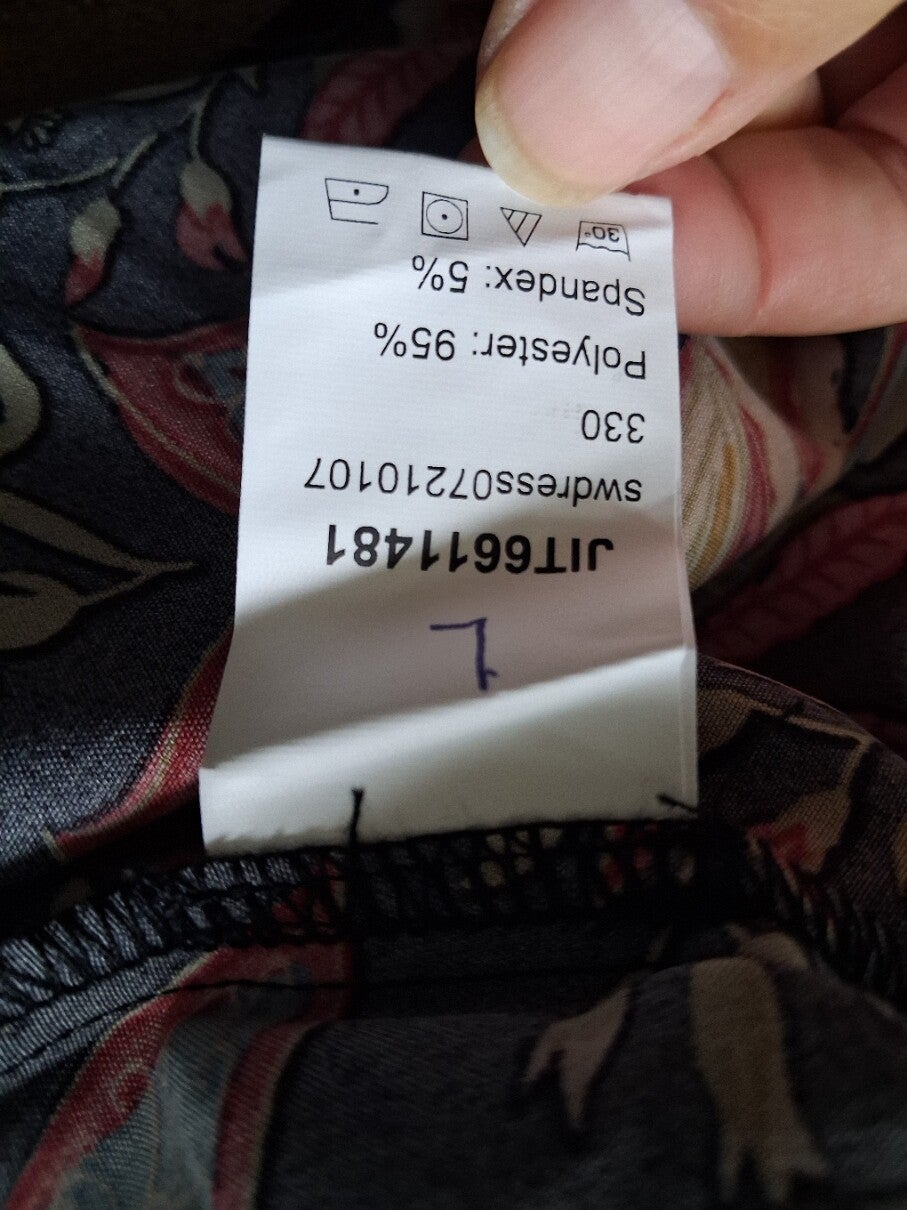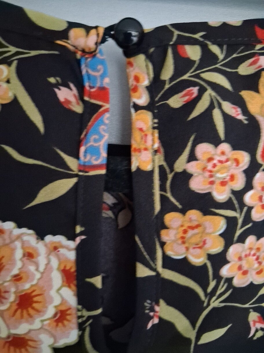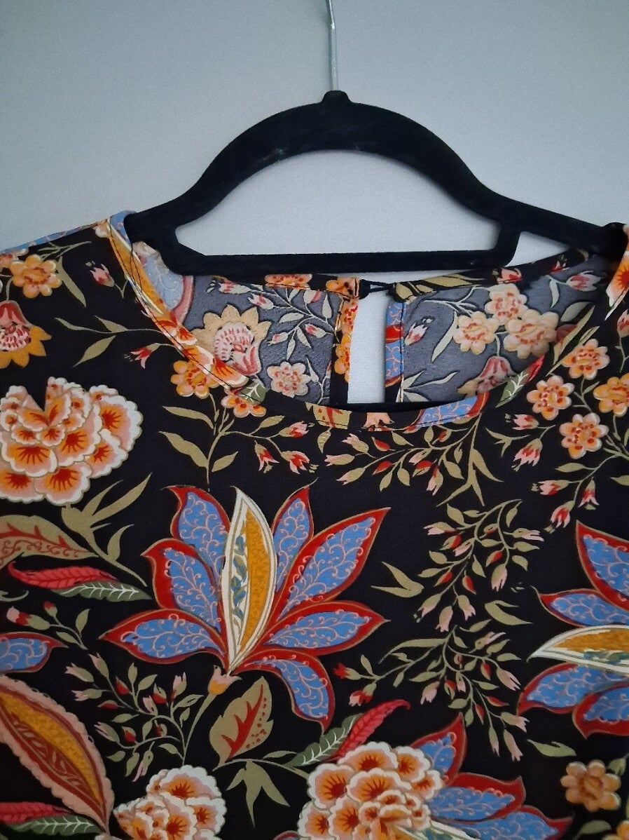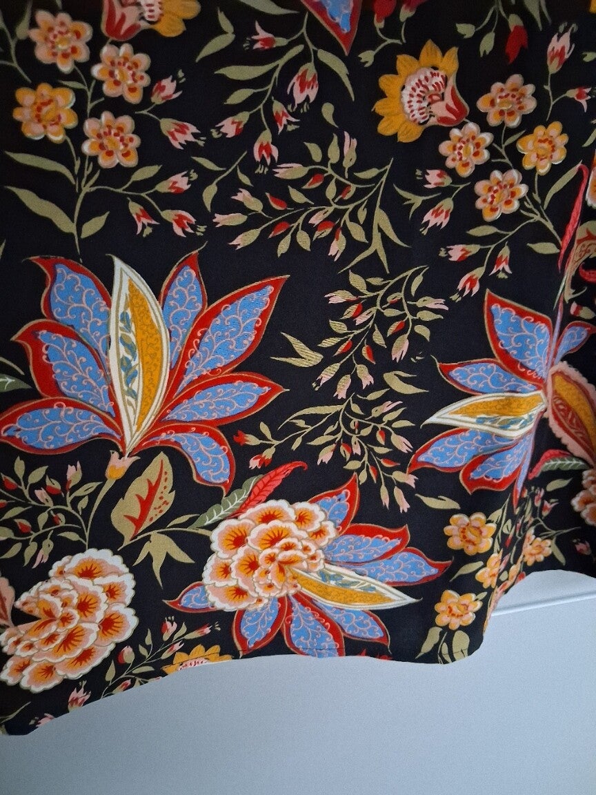 Zo goed als nieuwe zomerjurk met een vrolijke bloemenprint. Ideaal voor de vakantie of een zonnige dag. Maat L. Bestel op werkdagen voor 15:00 en hij wordt dezelfde dag verzonden! 100polyester. kleur: zwart meerkleurig Schouder : 40 cm Buste : 107 cm Taille : 115 cm Heupen : 124 cm Mouw lengte : 20.7 cm Lengte : 88.7 cm