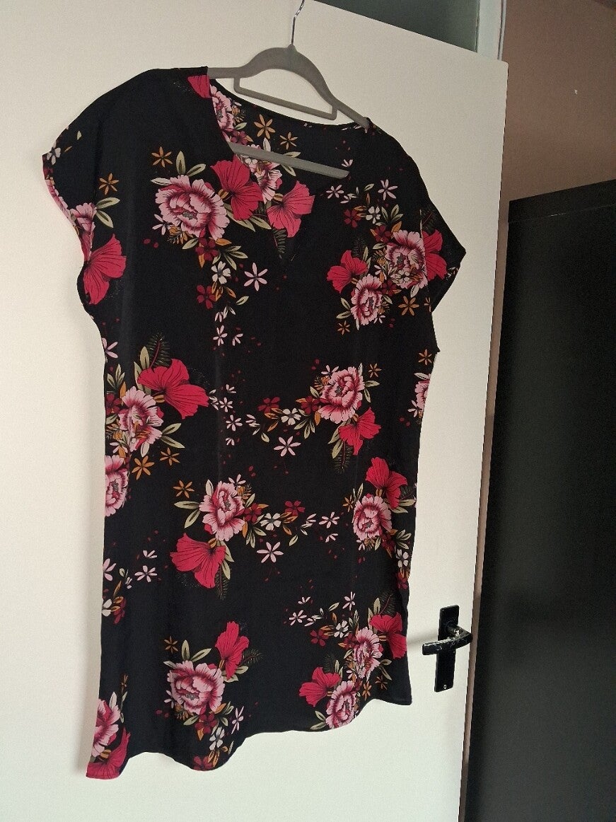 Prachtige zomerjurk in maat L. De jurk is zo goed als nieuw en perfect om mee te nemen op vakantie. De stof is luchtig en ideaal voor warme dagen. 100% polyester. Deze luchtige jurk valt net boven de knie en heeft korte kapmouwen en v-hals. Kleur: Zwart rood roze 100% polyester. oksel 63cm lengte 91.5cm