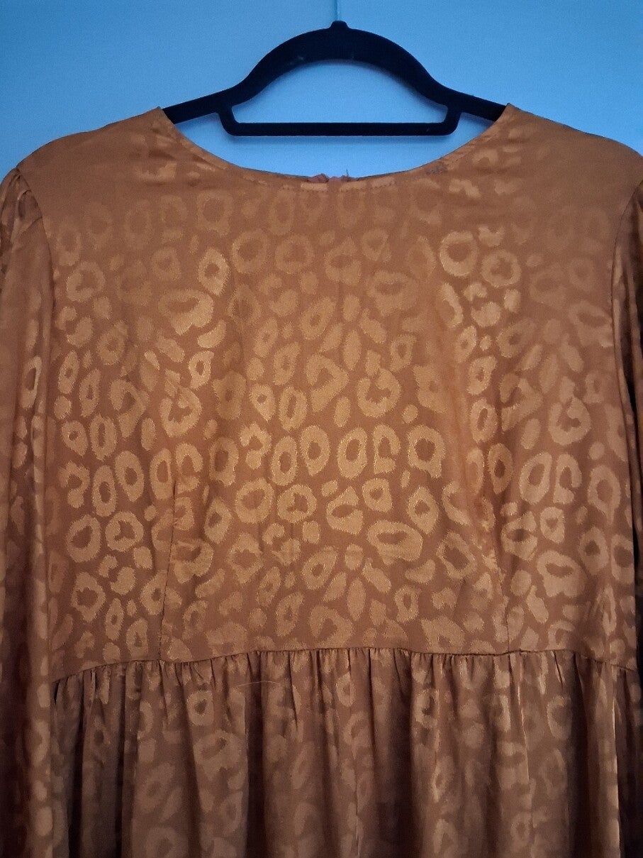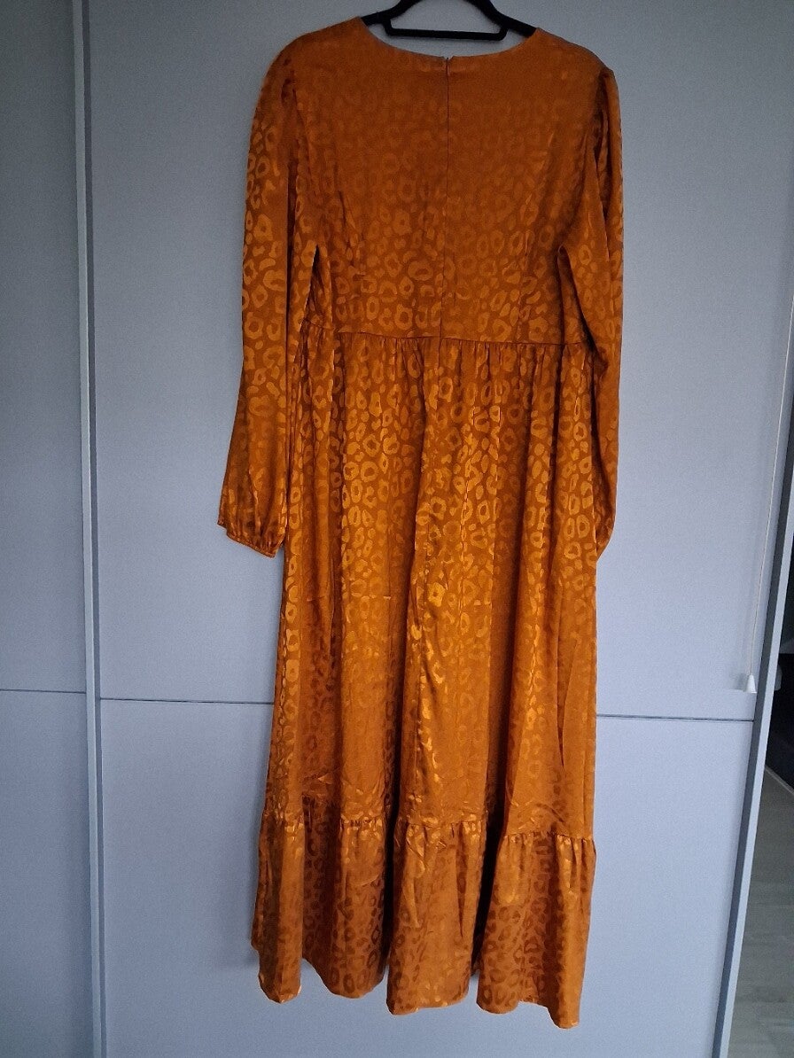 Prachtige, glanzende lange feestjurk met een opvallende panterprint in de kleur oranje. De jurk is zo goed als nieuw. Maat XL. Let op: het elastiek van één mouwuiteinde is iets losser. merk Shein.