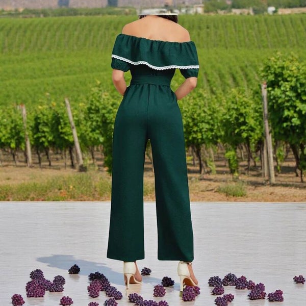 Offshoulder jumpsuit donkergroen met wit kanten randje wijd model en bijpassend donkergroene taillekoord 100% polyester maat XL elastische offschoulder rand rekbaar van 56-83cm elastische onderborst rekbaar van 40-59cm heup 60cm lengte 130cm