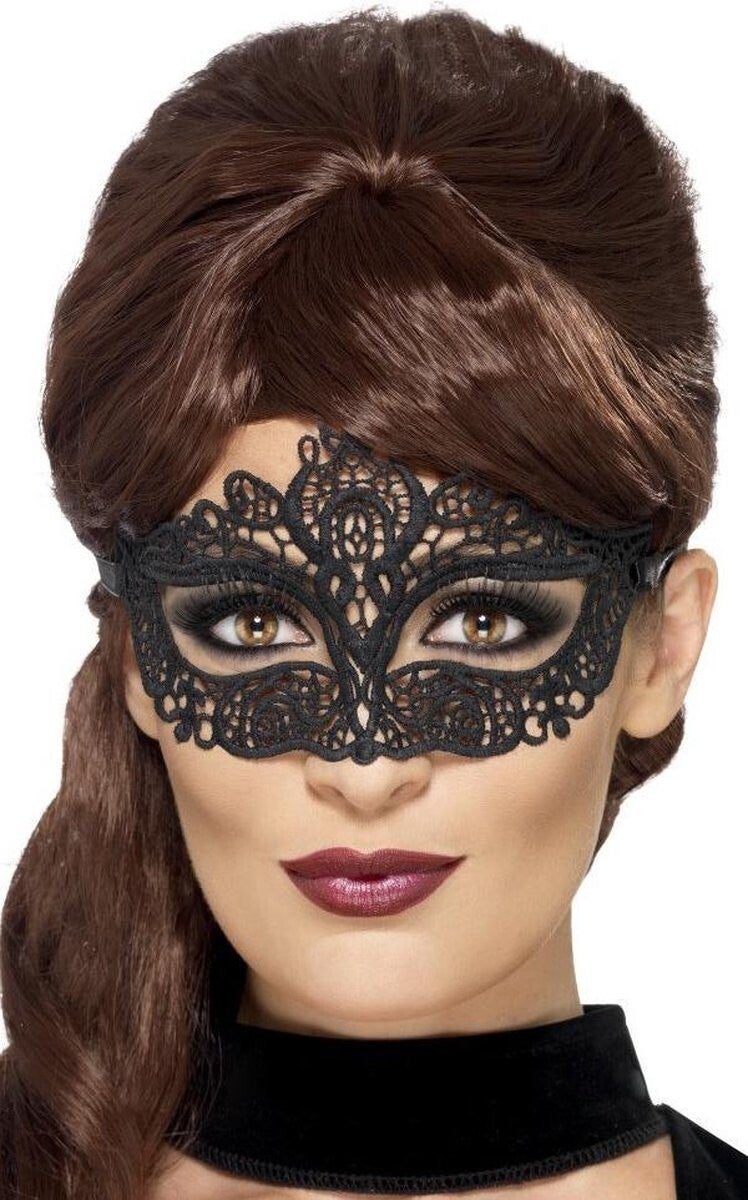 Zwart kanten oogmasker voor dames. Een mysterieus oogmasker, met geborduurd motief. Het masker is gemaakt van polyester. Het oogmasker bevat een lint om het vast te kunnen maken. Let op: dit is een verkleedaccessoire voor volwassenen, geen speelgoed.