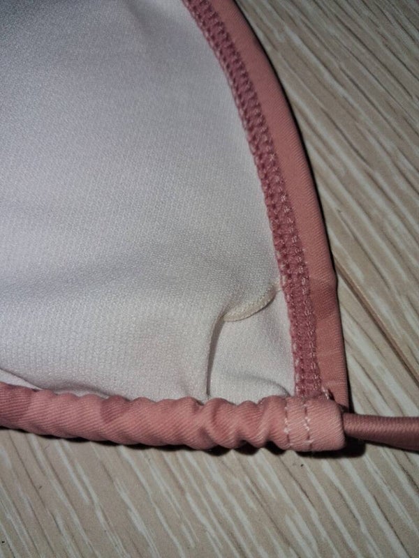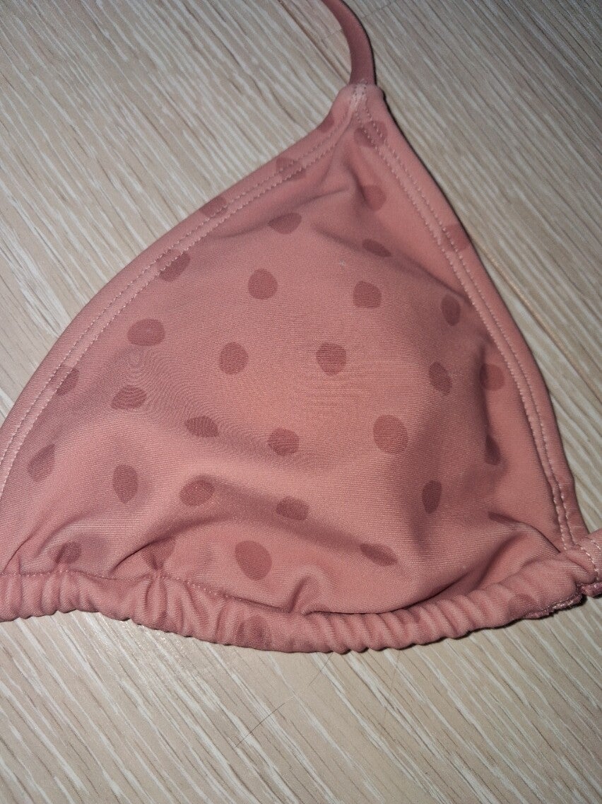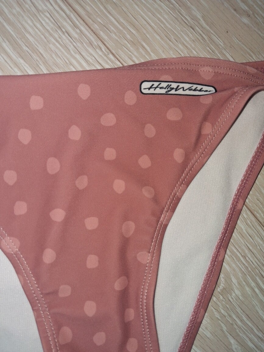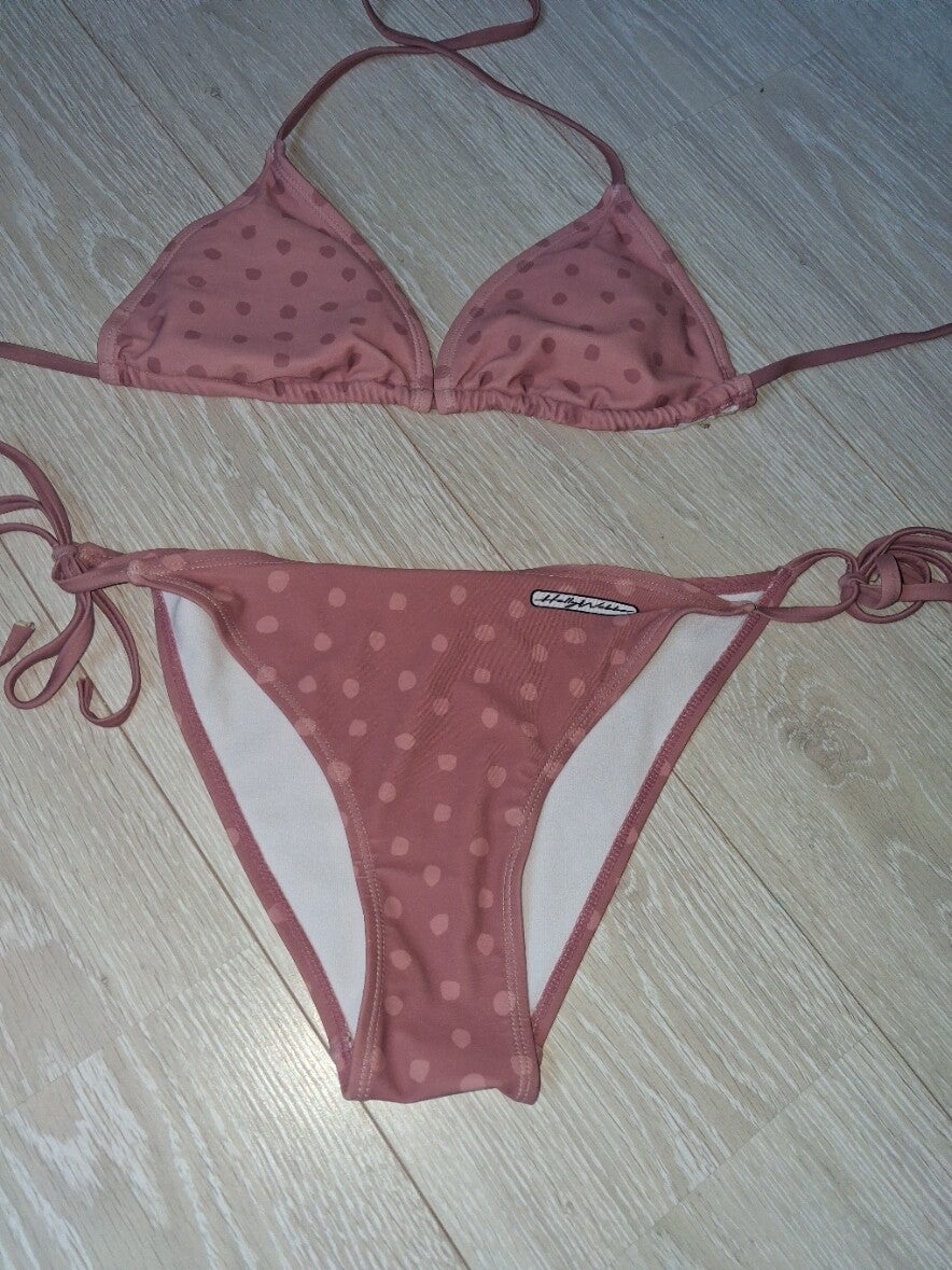 Deze bikini heeft een driehoekige top en een bikinibroekje met striksluitingen aan de zijkanten. De bikini is versierd met een stippenpatroon. Bikini oudroze met stippel patroon , de bikinitop heeft voorgevormde cup pads die uitneembaar zijn. maat L. merk Holly Webber. Label is eruit geknipt.