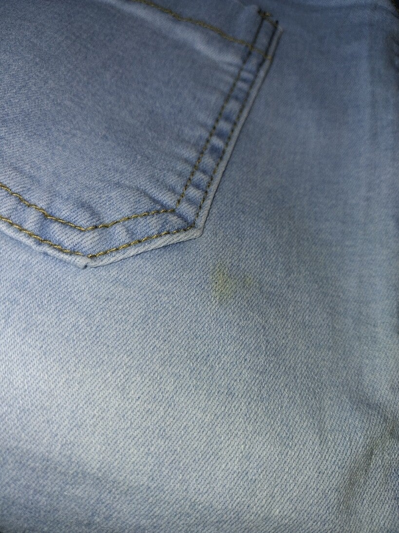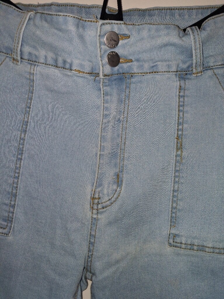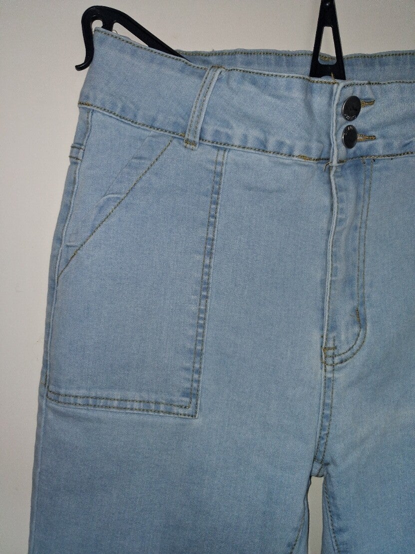 Deze lichtblauwe jeans heeft een hoge taille en een slanke pasvorm. De broek sluit met twee knopen en een rits. Aan de voorkant zitten twee opgestikte zakken en aan de achterkant twee opgestikte zakken. De stiksels zijn in een contrasterende kleur. Er is een kleine vlek op de achterkant van de broek, zoals te zien op de foto. Maat L afmetingen plat gemeten taille rekbaar 40-49cm heup rekbaar 48-58cm binnenbeen lengte 75cm totale lengte 104cm merk onbekend.