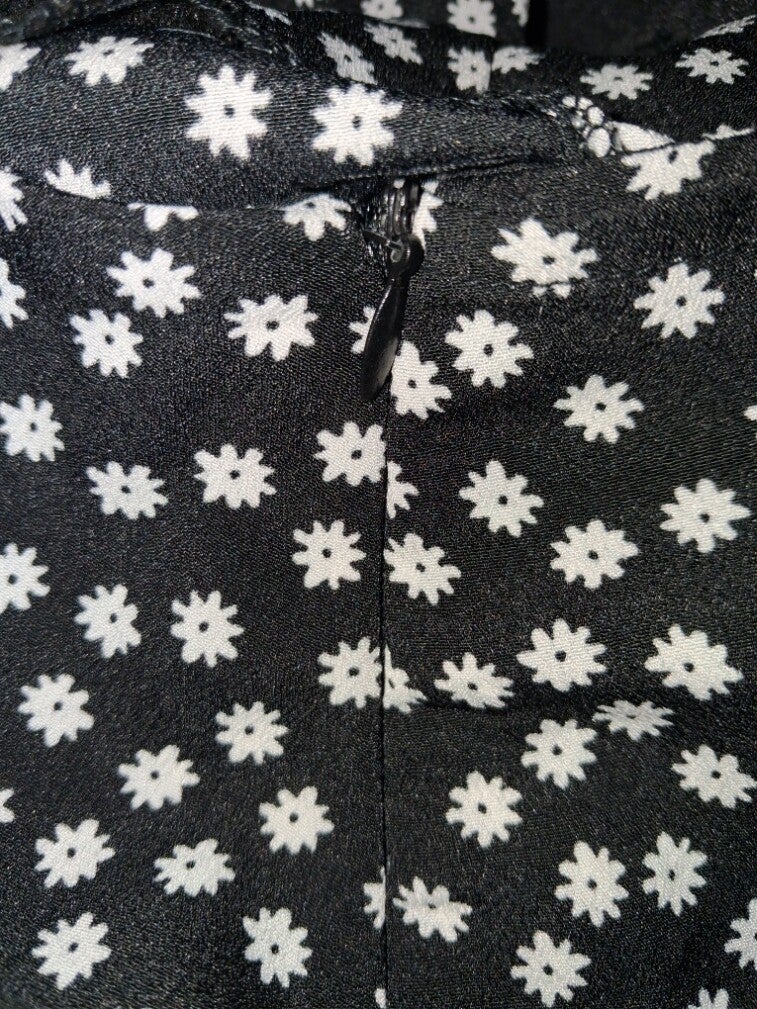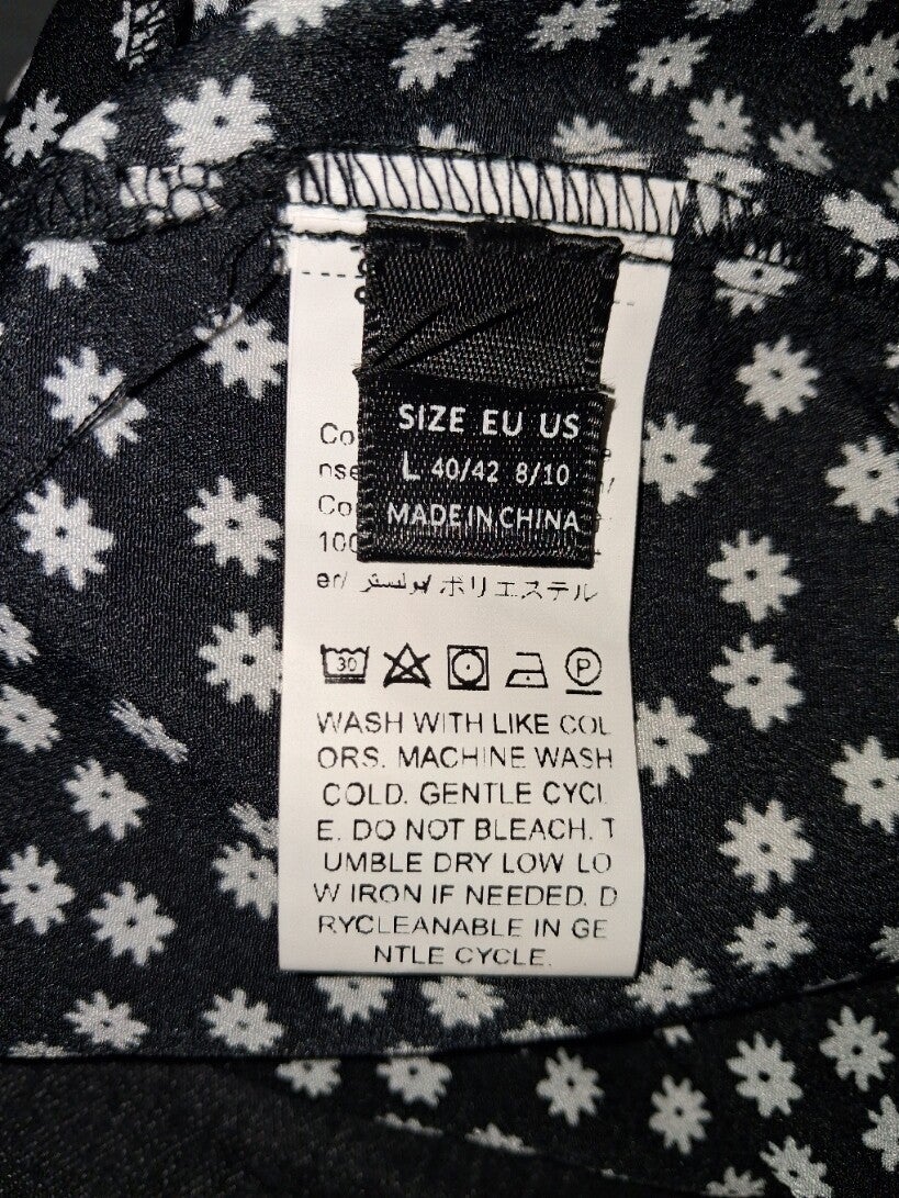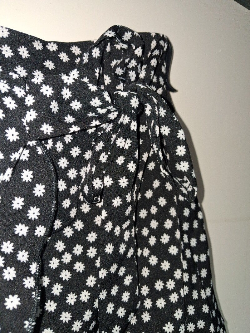 Deze zwarte broekrok met witte bloemenprint heeft een overslagdesign en ruches langs de zoom. De broekrok sluit met een rits aan de zijkant en heeft een strikdetail aan de taille. maat L afmetingen plat gemeten: taille 42cm heup 58cm lengte 39cm