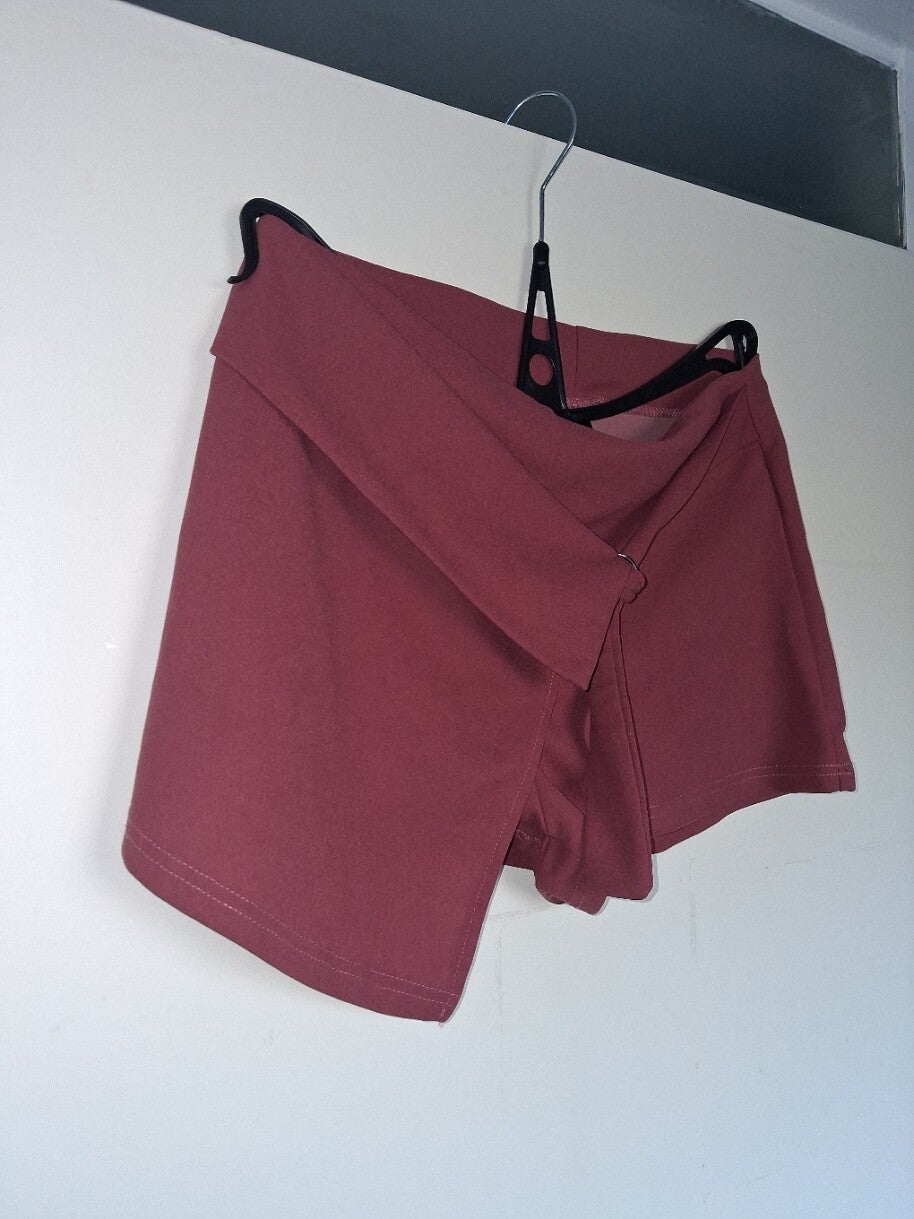 Zo goed als nieuw, Deze korte broek heeft een uniek overslagontwerp aan de voorkant, wat zorgt voor een speelse en stijlvolle uitstraling. De broek is voorzien van een decoratieve ring die de overslag bij elkaar houdt. De achterkant is effen en de broek heeft een comfortabele pasvorm. Perfect voor een casual of zomerse look. Maat L afmetingen: taille rekbaar 43-53cm heup 54-64cm lengte 30cm.